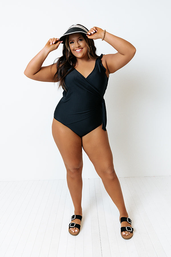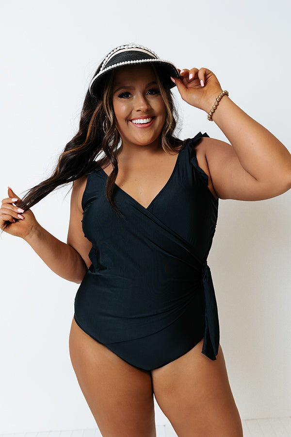 Take a walk on the wide side in this adorable black plus size one piece swimsuit featuring lightweight four-way stretch material patterned, a wrapped bodice with a side tie closure and a v-cut neckline, wide shoulder straps with subtle ruffled cap sleeves, a low scooped back, and a flattering figure hugging silhouette that ends in cheeky fit bottoms! This swimsuit comes with removable padding