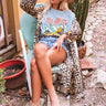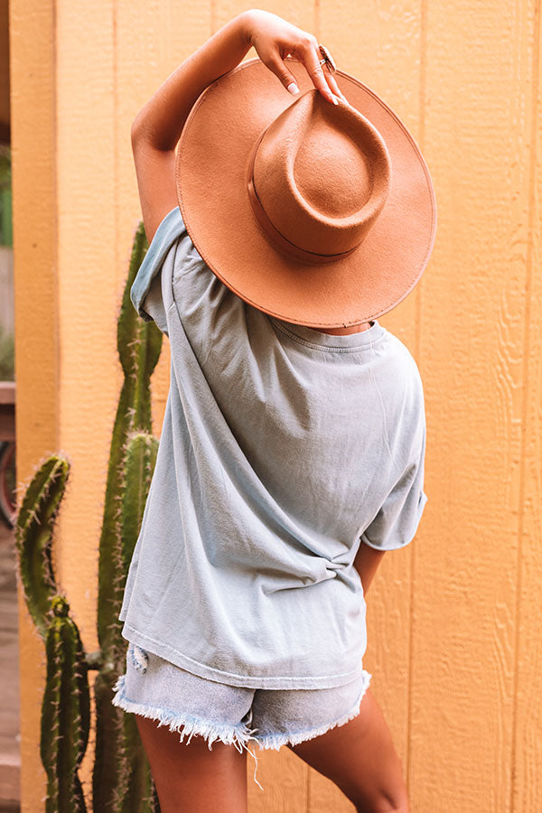 Take a walk in the "wild west" with this adorable airy blue hued boyfriend tee featuring soft lightweight material with a colorful desert scene and large lettering graphic on the front, a high rounded neckline, short loose sleeves with rolled cuffs, and a relaxed silhouette that falls into a straight hemline! We have layered this cutie under a leopard overlay with some distressed denim shorts and a brown bootie, fringe tote, and wool hat, but you can also wear it with some frayed white skinnies and "The Brighton Espadrille in Airy Blue!" Measurements