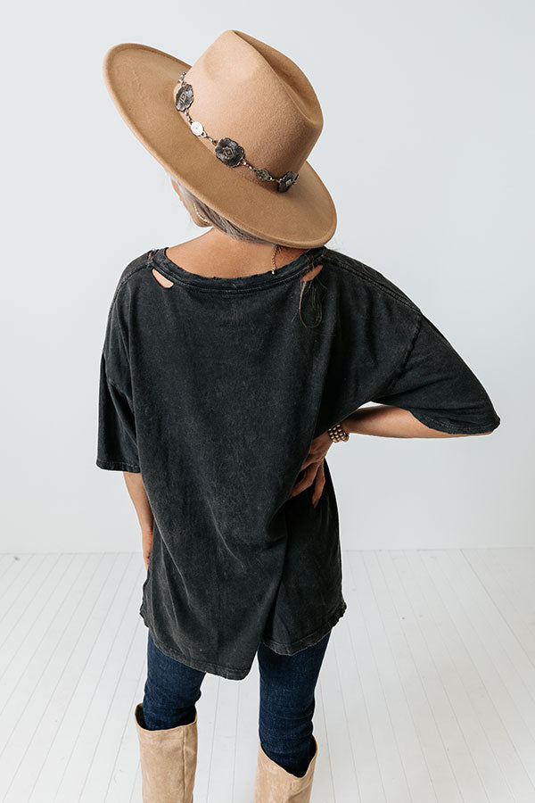Take a walk on the wild side with our adorable black 'Wild West' tee featuring soft lightweight material with a cute cowboy graphic on the front, a rounded neckline with distressed detailing, short loose sleeves, and a relaxed oversized silhouette that falls into a straight tunic-length hemline!