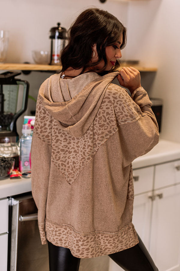 Strut along on the wilder side with this chic iced latte colored sweater featuring soft lightweight tight knit material, leopard print stripes with raw-cut trim detailing, a high rounded neckline with a drawstring hooded back, long oversized bell sleeves, and an ultra draped silhouette that falls into a straight tunic-length hemline with accent side slits! Measurements