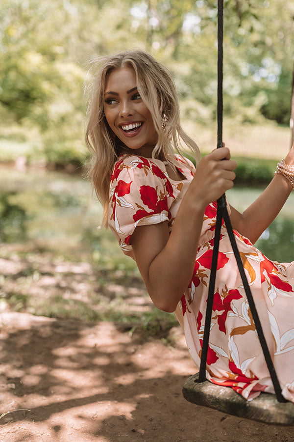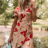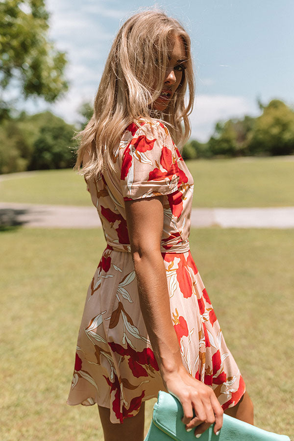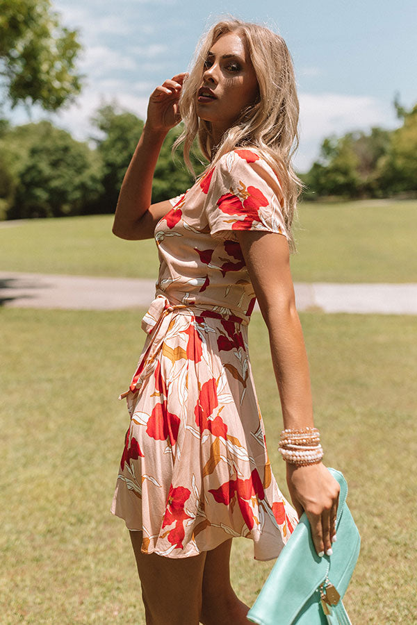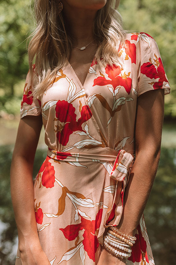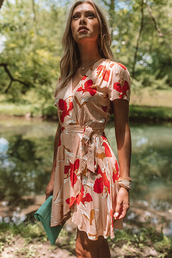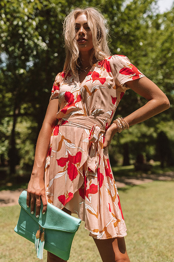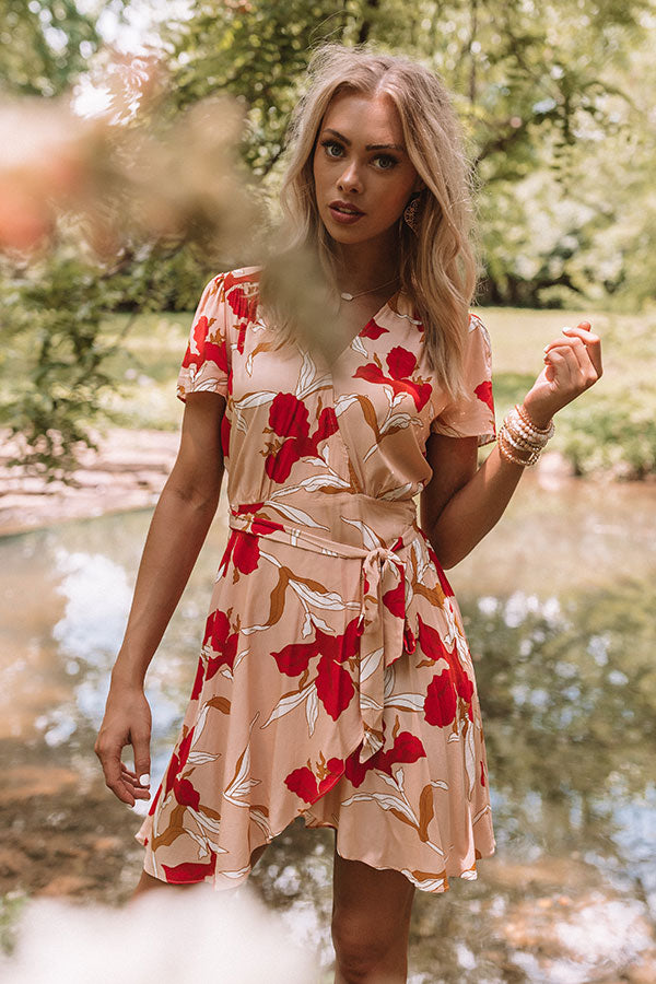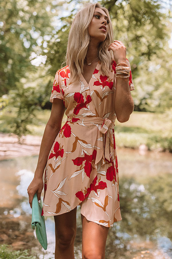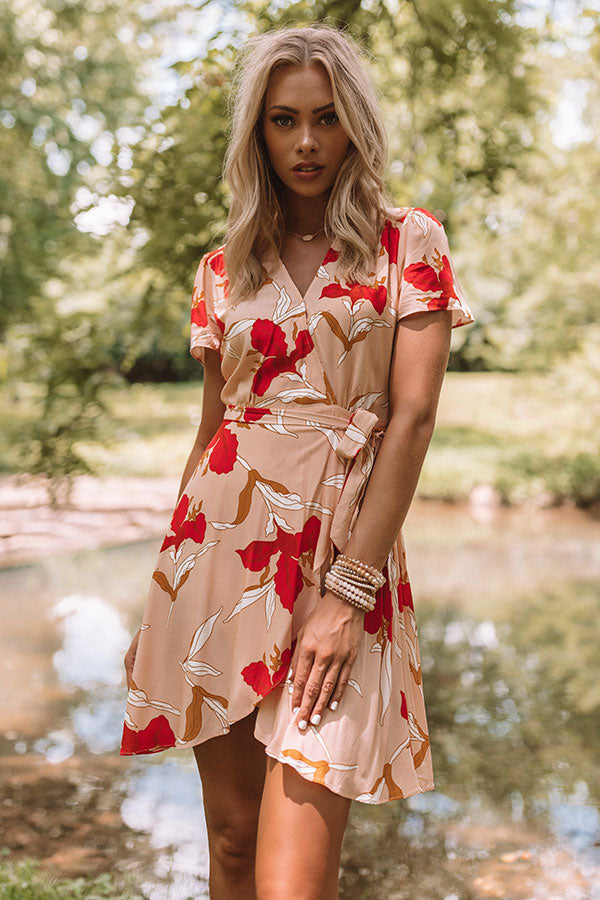In a field full of roses be a wildflower in this wrap dress with its bold pattern, flowy fit, and tie belt! Style with matching red heels and a contrasting clutch for a striking summer outfit that will catch people's attention from miles away! Measurements