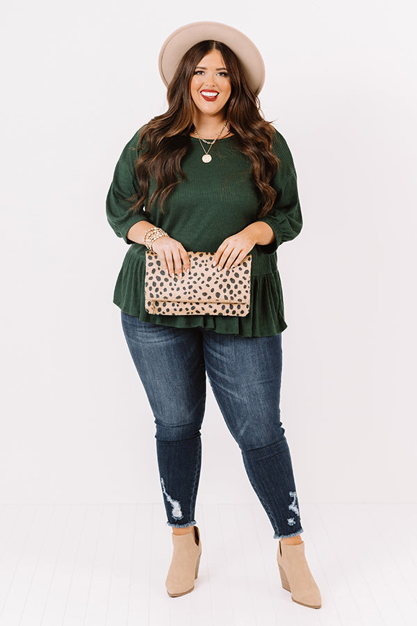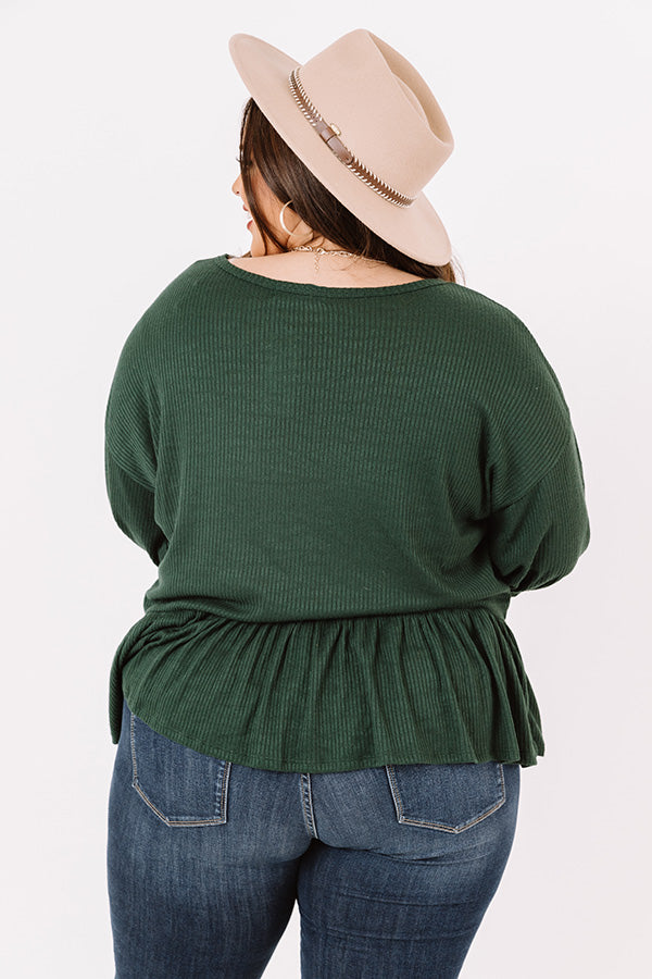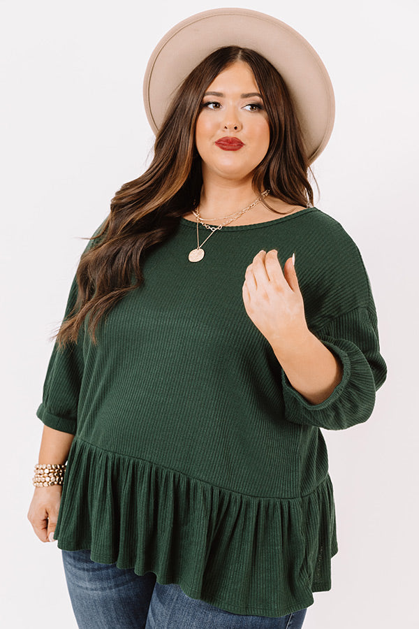 Plus Size - Slay all day in our charming hunter green colored "Willow Walk" shift top featuring soft lightweight flowy tight knit material with subtle vertical ribbed texturing, a high rounded neckline, loose 3/4-length sleeves with fitted cuffs, and an ultra relaxed silhouette that falls into a peplum bottom with an uneven hemline! Measurements