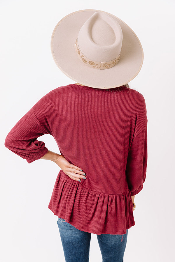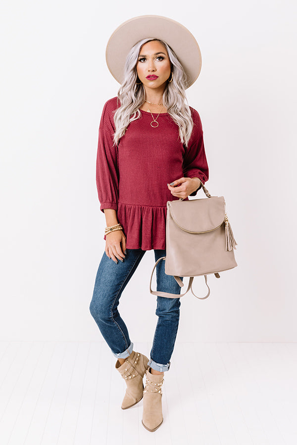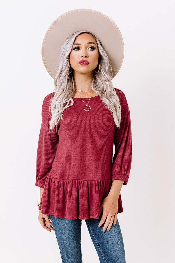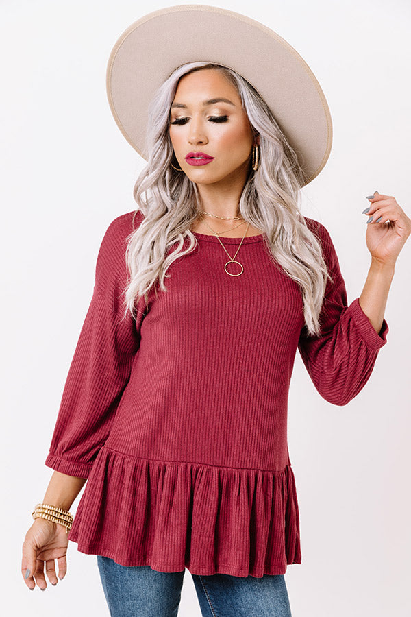 Slay all day in our charming wine colored "Willow Walk" shift top featuring soft lightweight flowy tight knit material with subtle vertical ribbed texturing, a high rounded neckline, loose 3/4-length sleeves with fitted cuffs, and an ultra relaxed silhouette that falls into a peplum bottom with an uneven hemline!