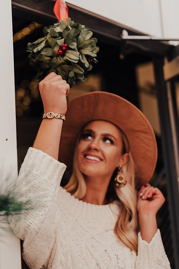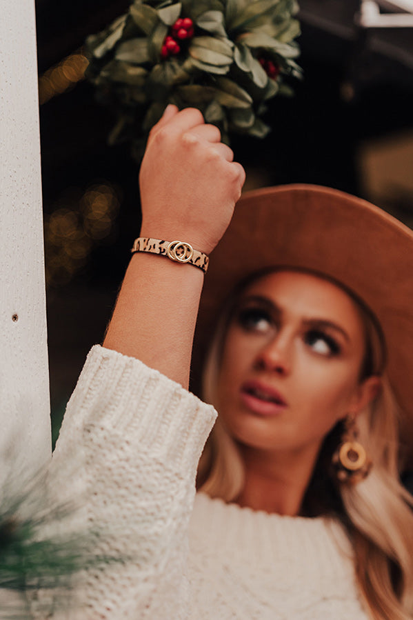 Make a statement with our "Wilshire Boulevard" bracelet featuring a black and beige leopard print band with two interlinked circle accents!