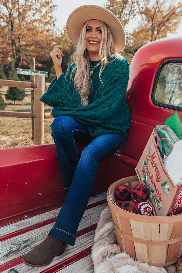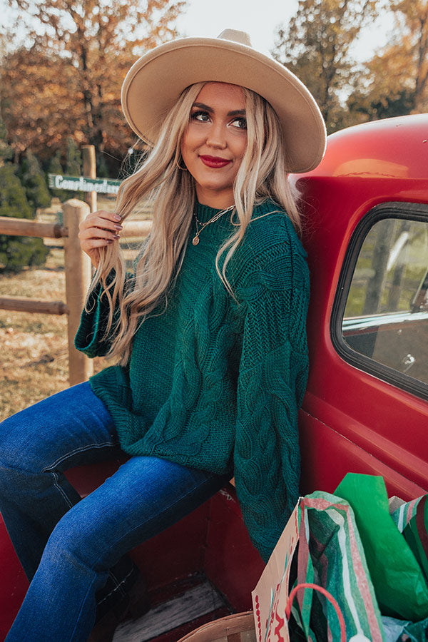 Stay warm and protected from the fall windchill with this gorgeous hunter green sweater featuring soft and thick material with oversized cable knit texturing, a high rounded neckline, long loose sleeves with flared cuffs, ribbed trim detailing, and a slouched silhouette that ends in a straight hemline! Measurements