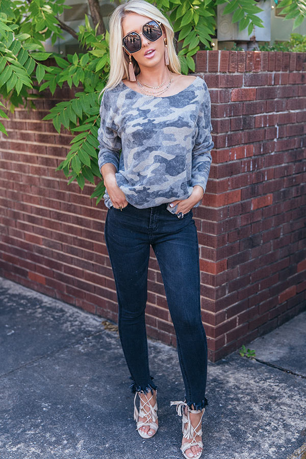 Netflix & Chill... ed wine!? Pour a glass of pinot, this effortlessly stylish camo top is ready to relax & binge watch Gossip Girl in style! This cute camo top has a relaxed neckline (that can be taken off the shoulder), long sleeves, an ultra cozy lightweight knit bodice & a sassy twisted open back. Style this "casual cute" camo top with your favorite black distressed denim for an effortlessly edgy look in minutes. - Hand wash cold. Line dry. - Unlined, but not see through.