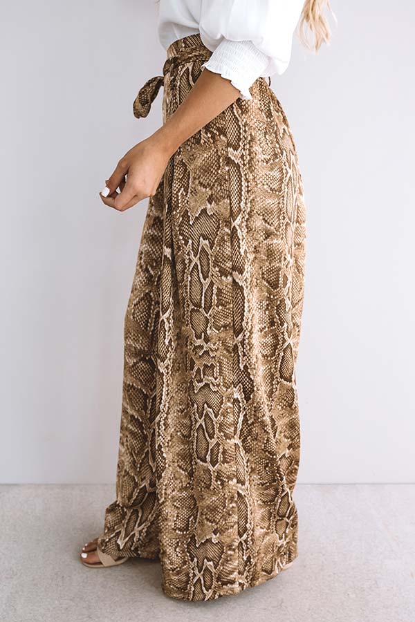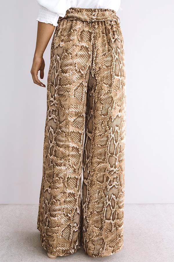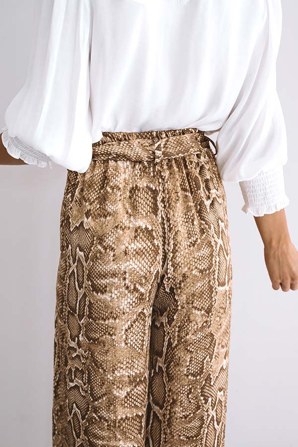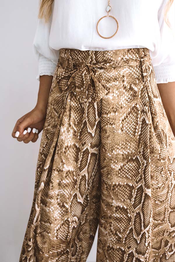 Show everyone you aren't afraid to take a walk on the wild side with the "Wine And Divine" bottoms featuring a striking brown snake print, lightweight material, a wide elastic waistband, belt loops with a tie belt, and ultra breezy ankle length pant legs with straight hemlines! You can dress this piece up girl boss style with a basic white top, dainty jewelry, and a simple neutral heel and crossbody, or you can give them an edgy personality when you pair them with our "Girl Power Shift Tee," "The Layla Heel in Black," and our "All Caught Up Headband in Black!" Measurements