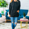 It's a tunic. It's a hoodie. What more could you want?! Curl up with your favorite glass of wine in this oh so cozy Fall essential! This fuzzy wuzzy fabric and front pocket will keep you warm on those chilly crisp days and the draw string hood adds some flair!