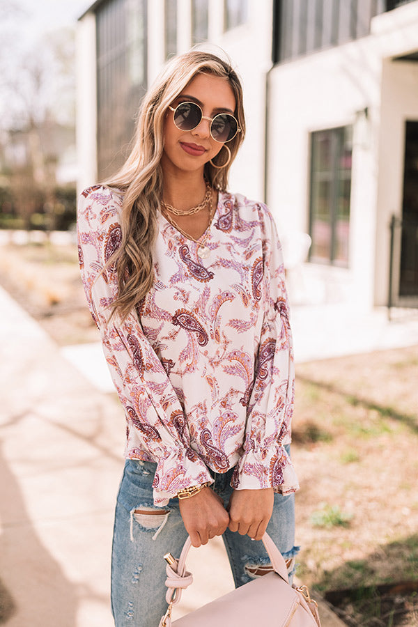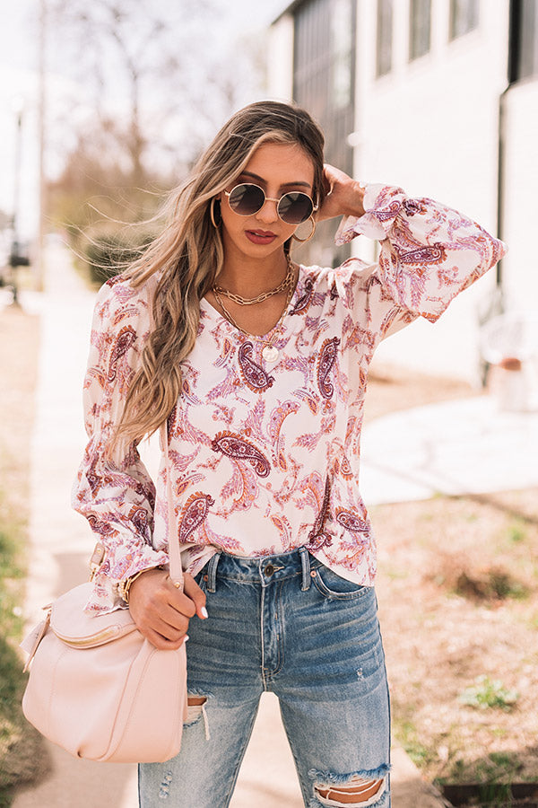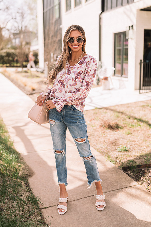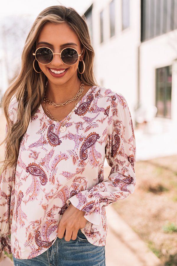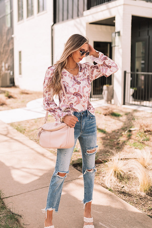 You are guaranteed to turn heads when you complete your look with our cute 'Wine Grove' shift top featuring lightweight flowy material patterned with a blush and purple hued paisley print, a scooped neckline, long loose sleeves with flared cuffs, and a relaxed silhouette that falls into a straight hemline! Measurements
