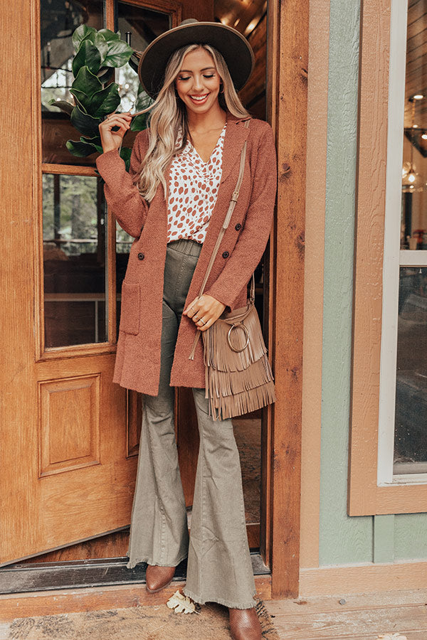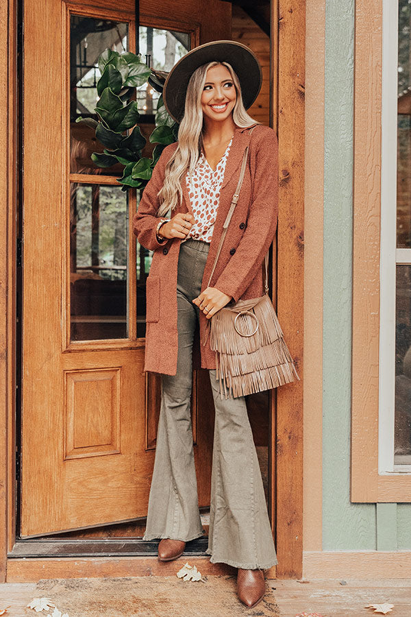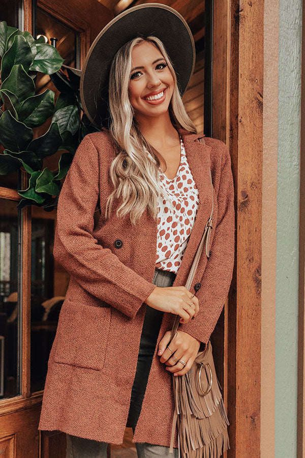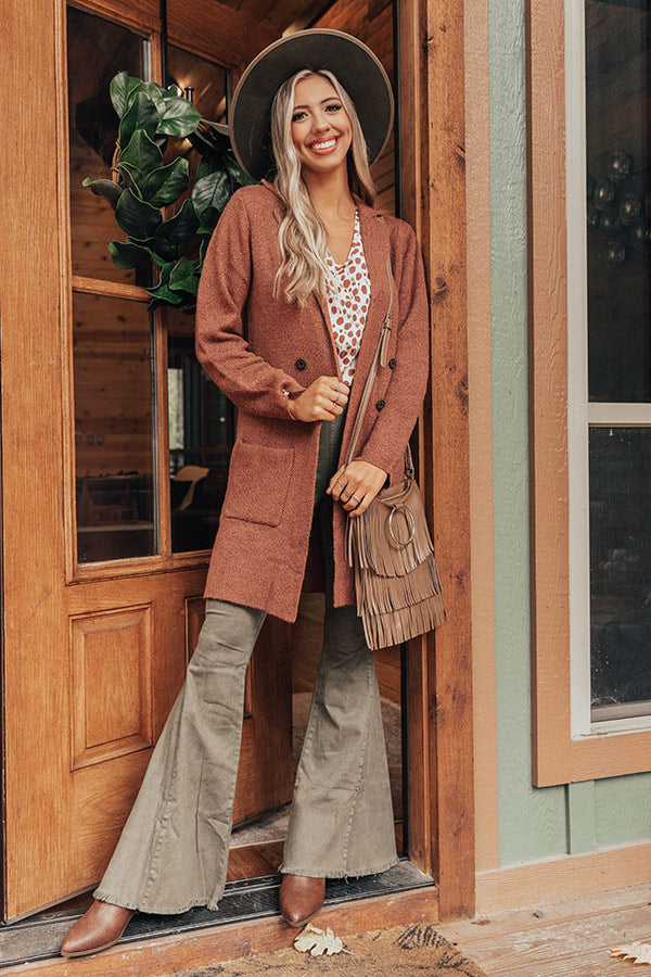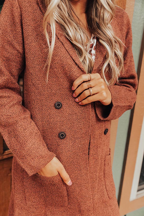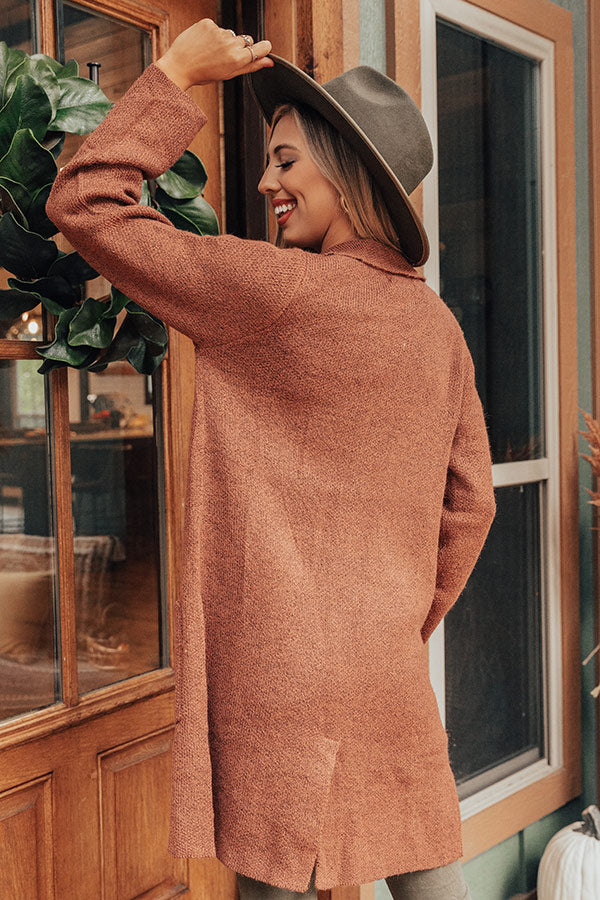 Stay warm in style with our adorable rustic rose colored "Wine In Winter Park" coat featuring soft lightweight material, long loose sleeves, a collared neckline with v-notch detailing, low accent side pockets, a button down front, and a slouched silhouette that falls into a straight mid-thigh length hemline! Measurements