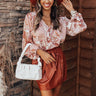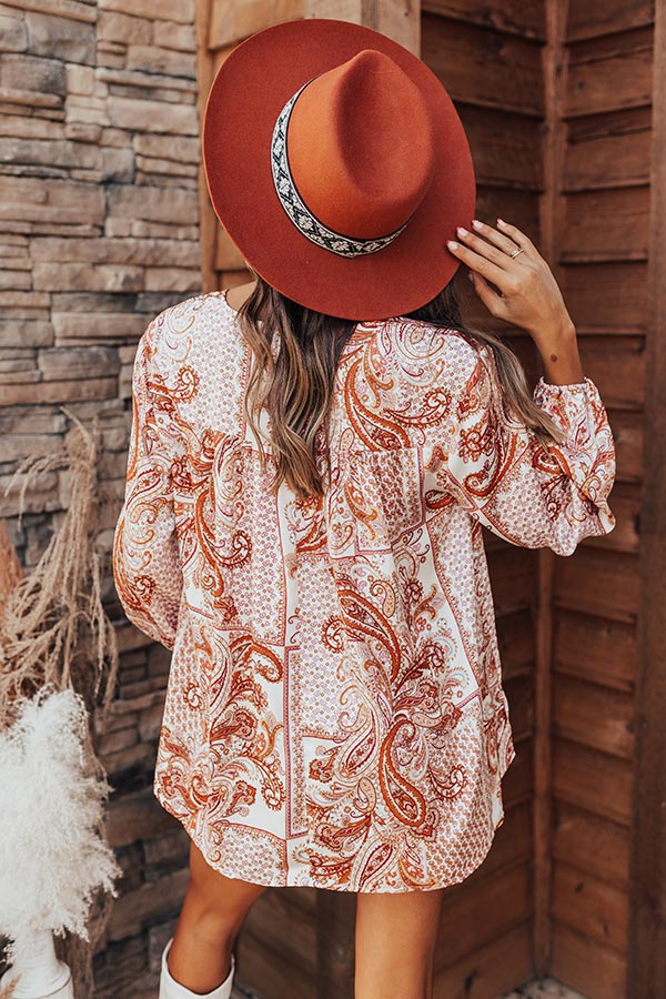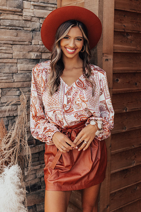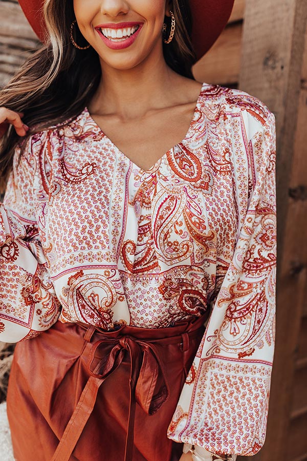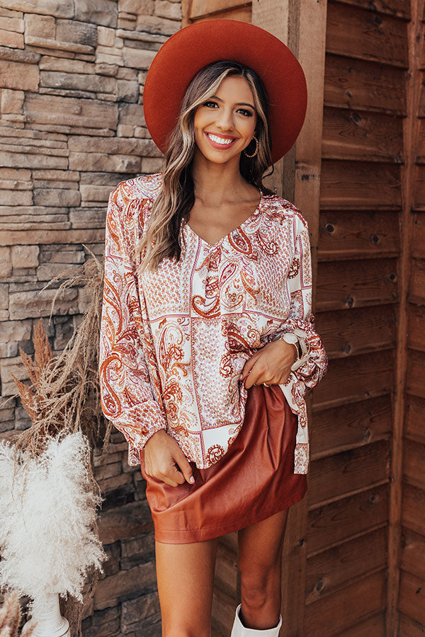 Mix up your everyday style with this eye-catching top featuring lightweight material patterned with a chic rust hued paisley print, a v-cut neckline, long bubble sleeves, and a relaxed but flattering silhouette that falls into a rounded hemline! Measurements