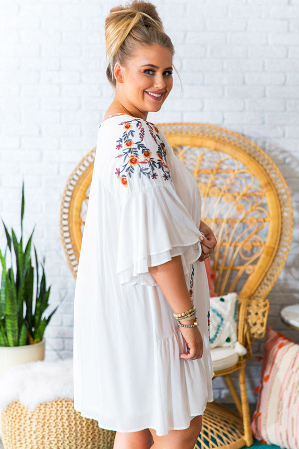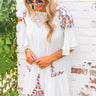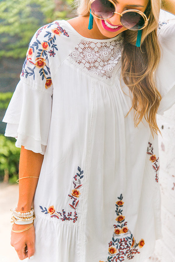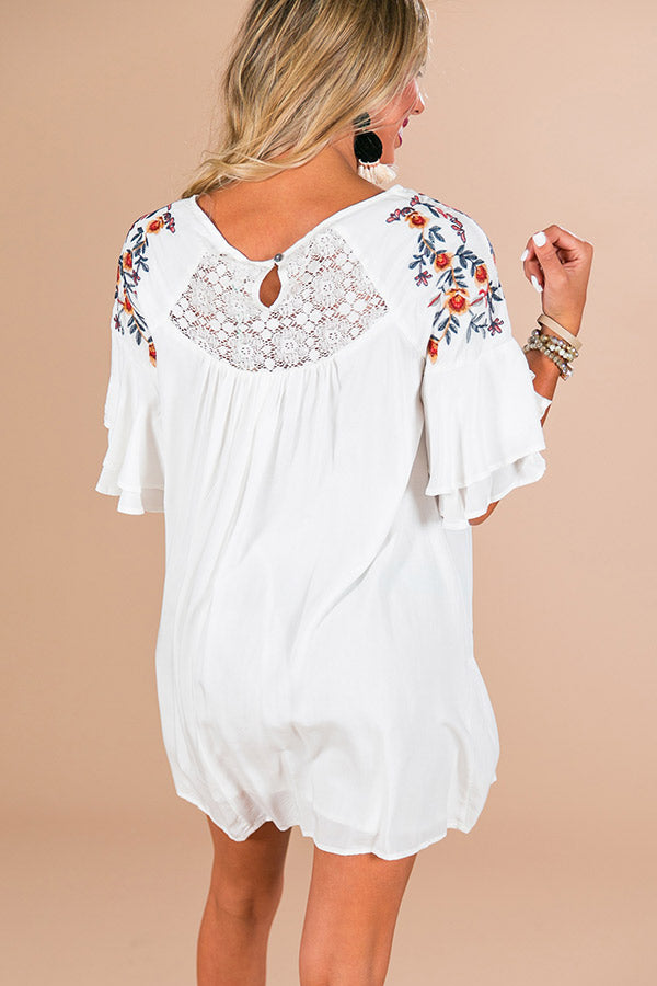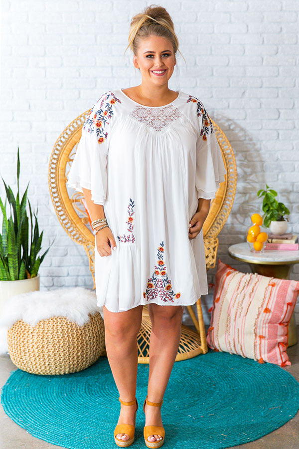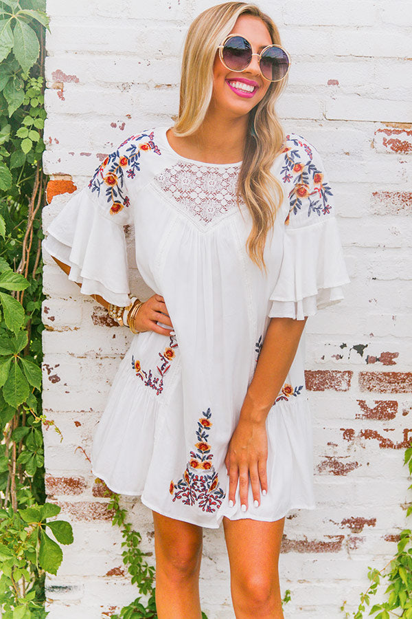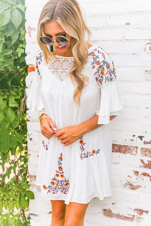 The "Wine On The Patio Embroidered Shift Dress" is ready to be wined & dined! This chic shift dress has a gorgeous crochet neckline & upper back, flirty flounce sleeves & a relaxed shift silhouette with gorgeous floral embroidery accenting the shoulders & bottom hem of the dress. Style with your favorite oversized sunnies & a sassy wrap heel for a chic look with boho vibes!