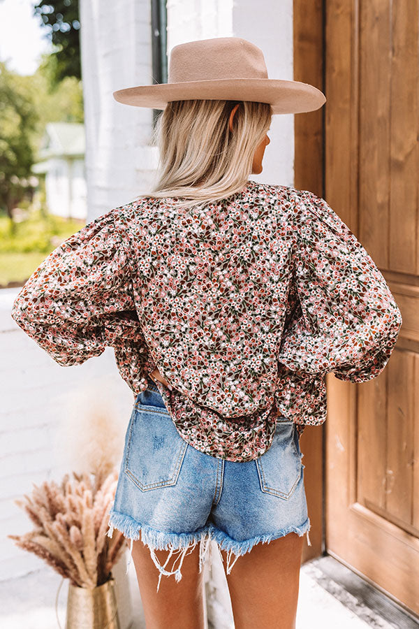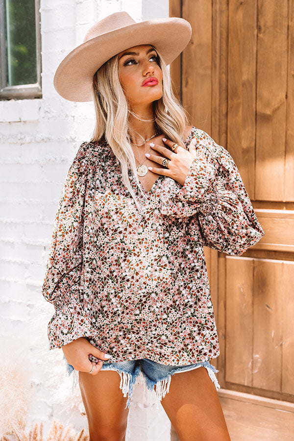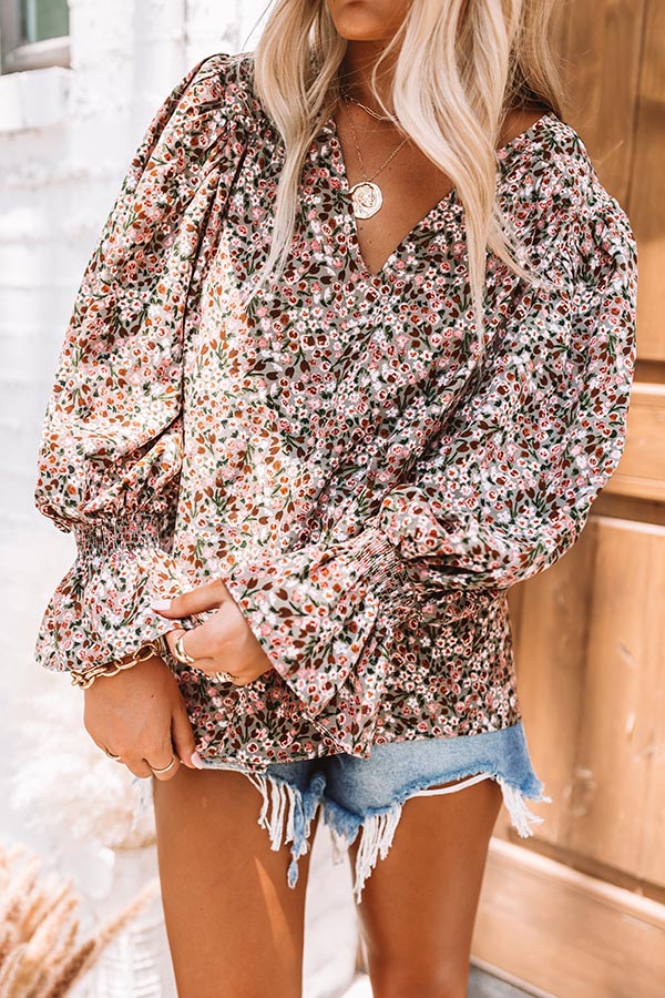Upgrade your year round wardrobe with our boho dark grey 'Wine Toast' shift top featuring lightweight material patterned with a cute pink, green, and natural hued floral print, a v-cut neckline, long loose sleeves with flared cuffs, and a relaxed silhouette that falls into a straight hemline! Measurements