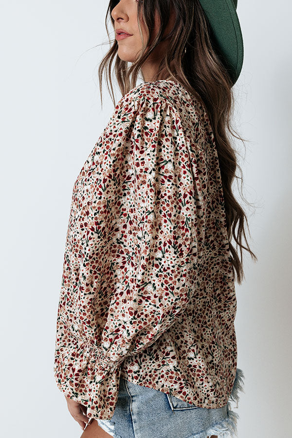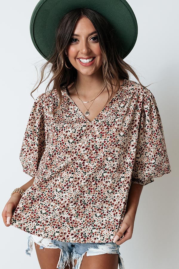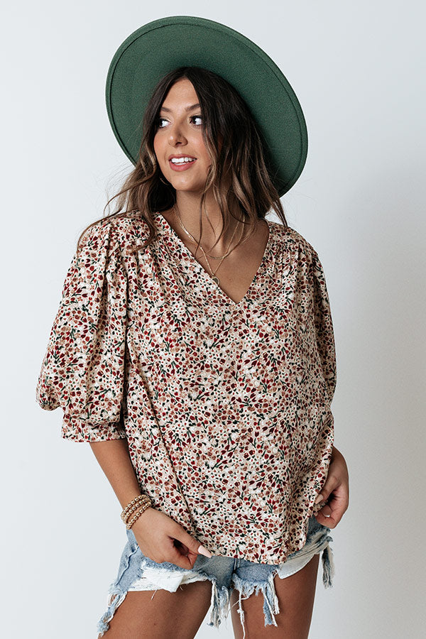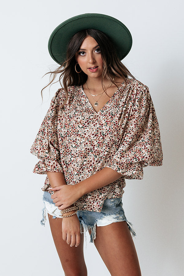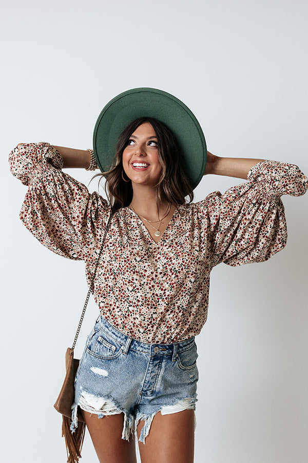 Upgrade your year round wardrobe with our boho iced latte colored 'Wine Toast' shift top featuring lightweight material patterned with a cute pink, green, and natural hued floral print, a v-cut neckline, long loose sleeves with flared cuffs, and a relaxed silhouette that falls into a straight hemline!