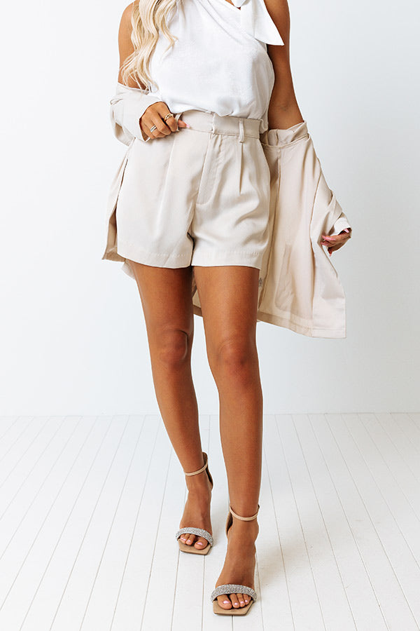 You will look like the ultimate girl boss in our chic beige colored 'Winning Awards' shorts featuring sleek lightweight material, a high waistline with belt loops and an elastic back, accent side pockets and a single accent back pocket cut, a hook closure, subtle pleated detailing, and a flattering silhouette that ends in straight upper-thigh length hemlines!