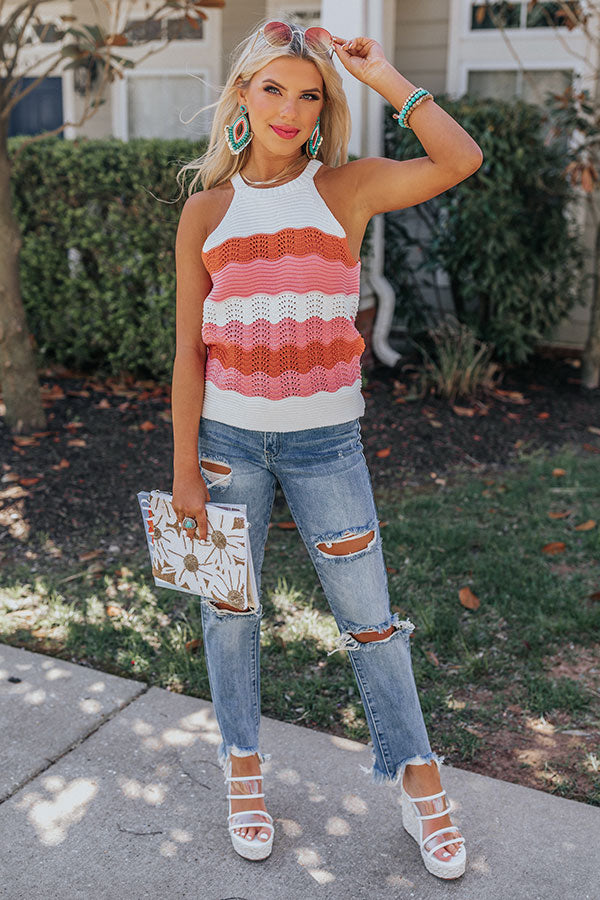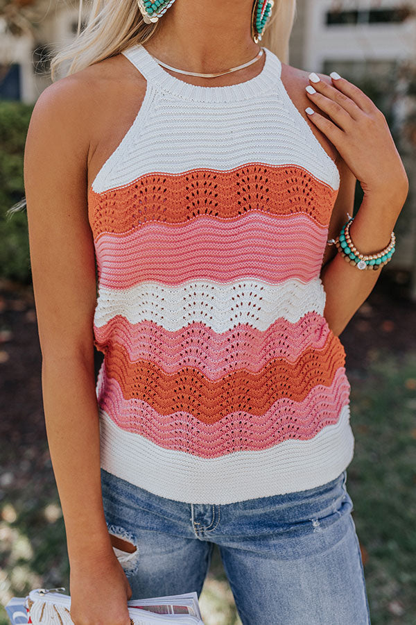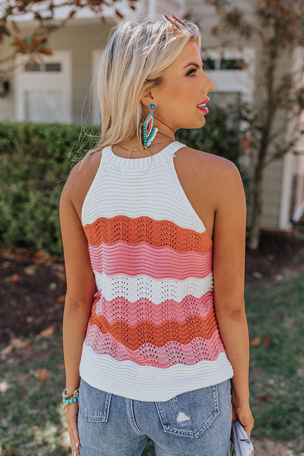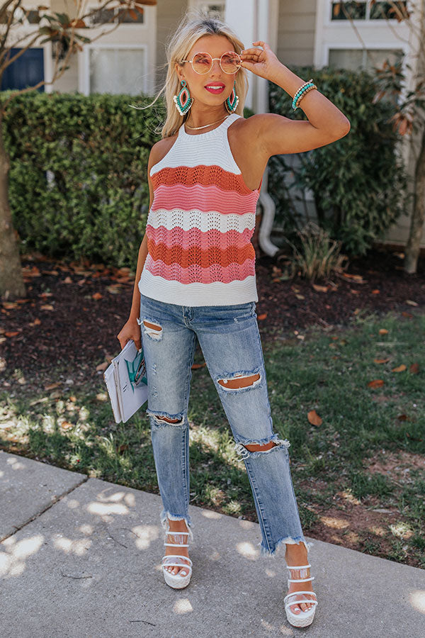 Strike a pose in our vibrant 'Winning London' top featuring soft lightweight loose knit material patterned with horizontal red/pink hued accent stripes, a high rounded neckline, sleeveless shoulders with a racerback fit, and a relaxed silhouette that falls into a straight hemline! Measurements