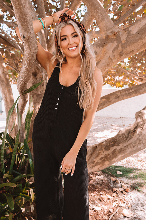 Show off your winning smile and amazing style with this charming black jumpsuit featuring soft lightweight material with waffle knit texturing, a button down front with a scooped neckline, wide sleeveless shoulder straps, accent side pockets, and an ultra slouched pants silhouette that ends in straight mid-thigh length hemlines!
