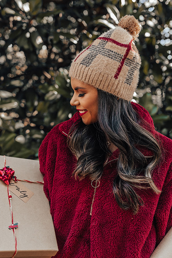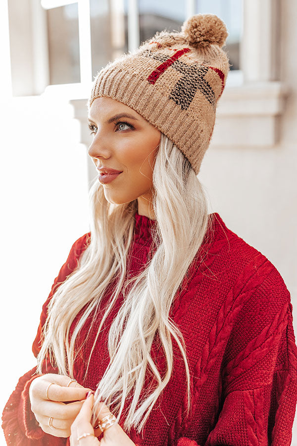 Winter is on the way, which mens it is time to pull out all your warm accessories including this adorable beanie featuring ultra soft knit material patterned with a red and brown plaid print, ribbed trim detailing, and a faux fur pom accent!