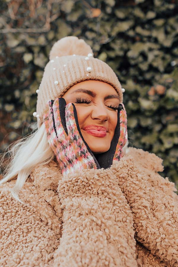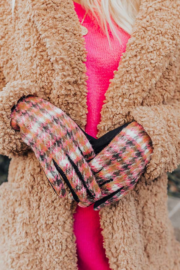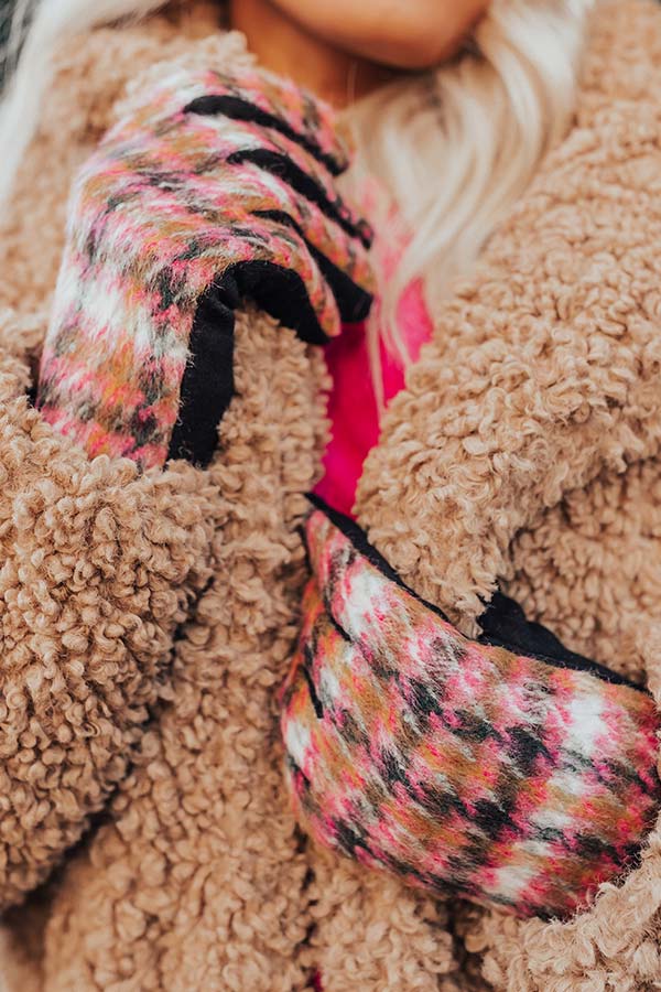 - Soft black faux suede and pink, yellow, camel, ivory, and green plaid patterned knit material