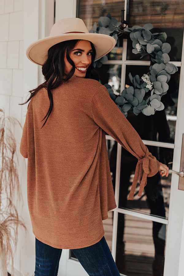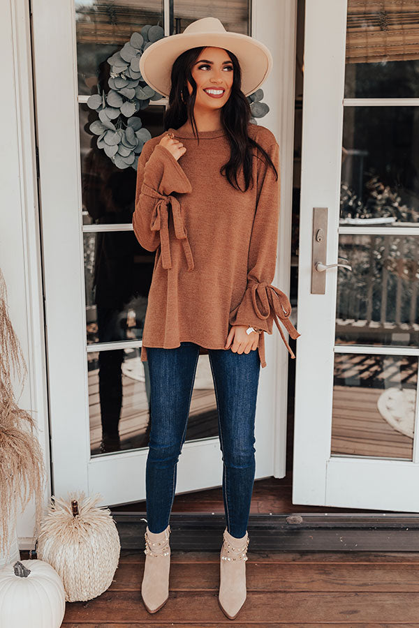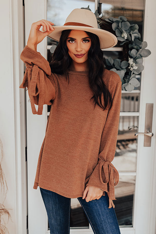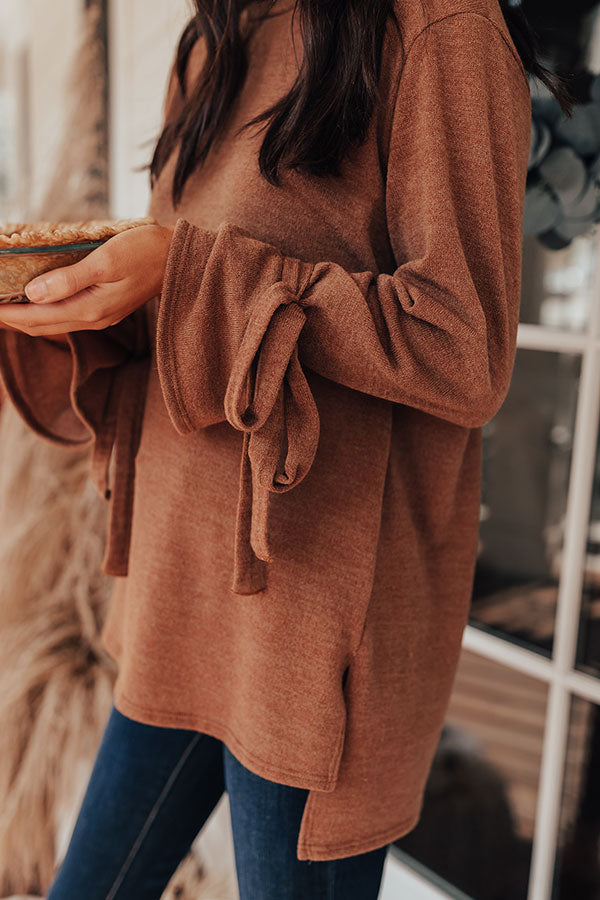 The coziest sweater has just arrived! Perfect for everyday, but with a hint of 'flare,' the camel colored 'Winter Weather Shift Top' is everything you could want and more. This sweater features a split high-low hem, with more coverage in the back, ultra soft and stretchy fabric, and long sleeves that flare at the wrist and are accented by ties. Measurements