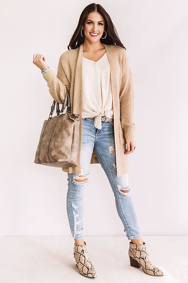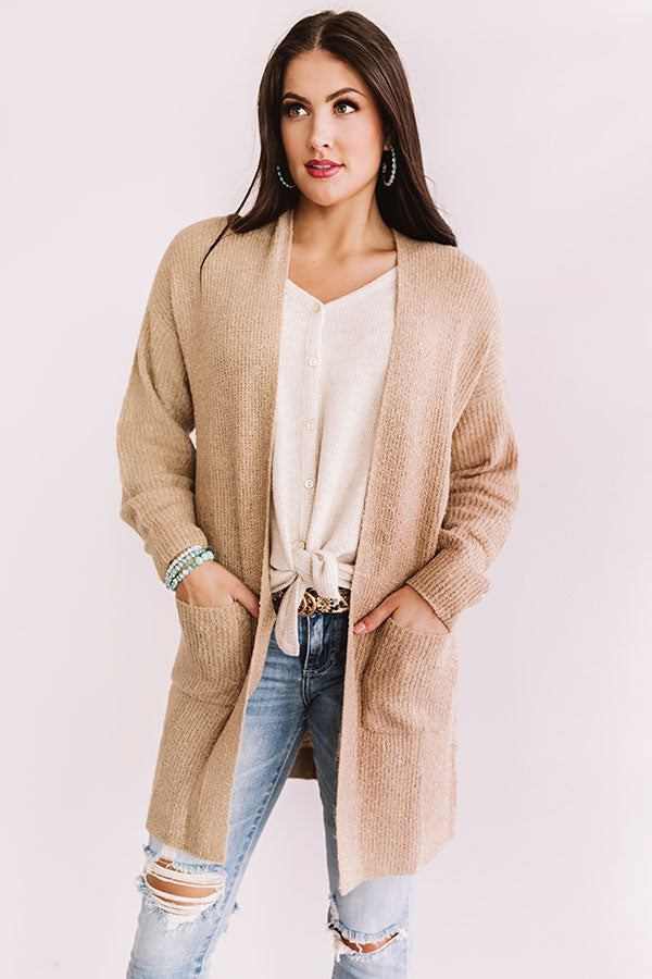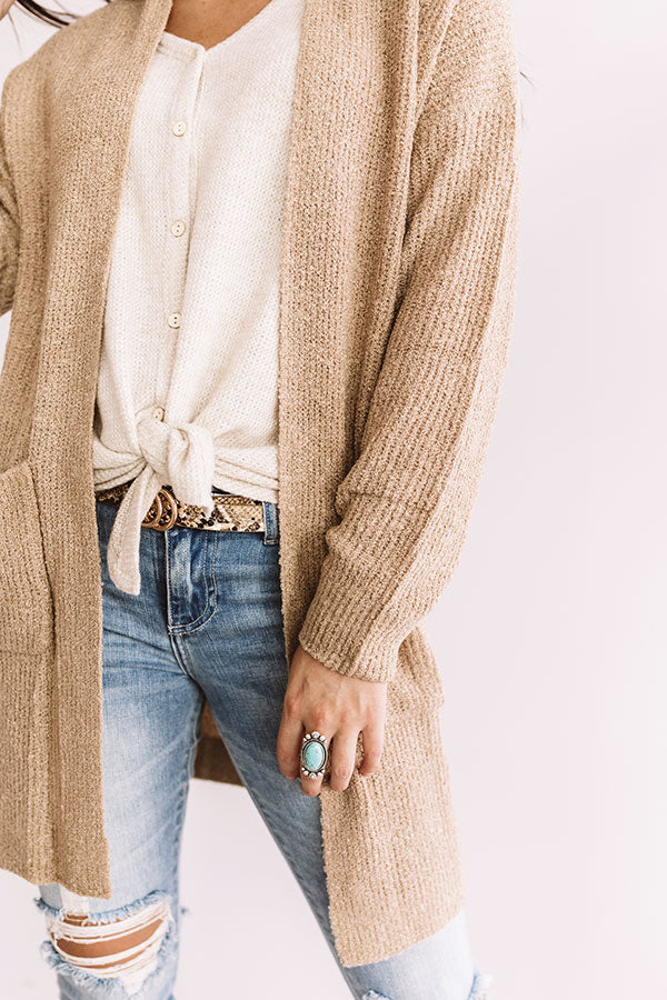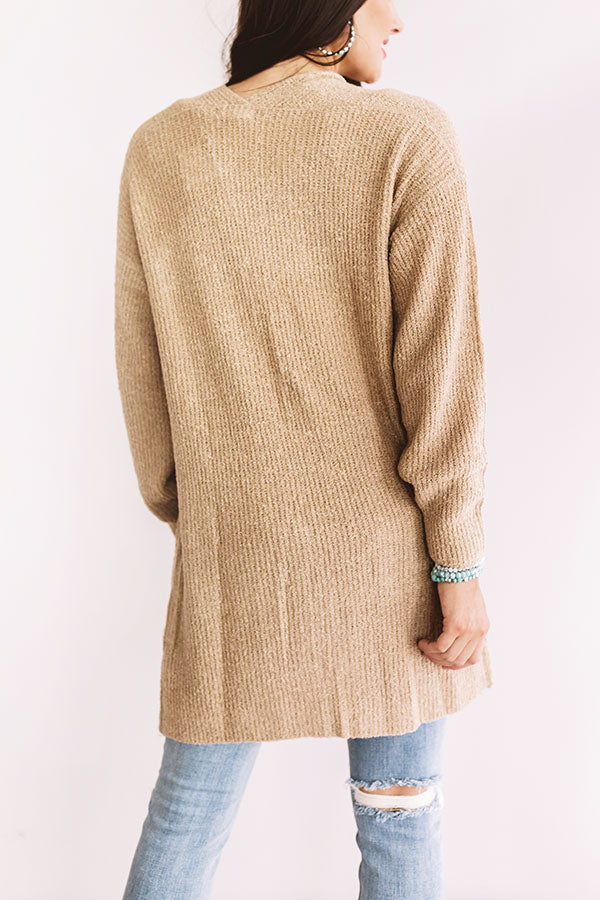 With all those chilly "winter weekends" approaching, we think you should treat yourself to a warm iced latte colored cardigan featuring a soft loose knit texture, long relaxed sleeves, accent side pockets, and an open front silhouette that falls into a mid-thigh length straight hemline! You can style this versatile piece with just about anything from a basic tank to a sweater, jeans to dresses, wedges to sandals, clutches to totes, and hats to earrings! Measurements