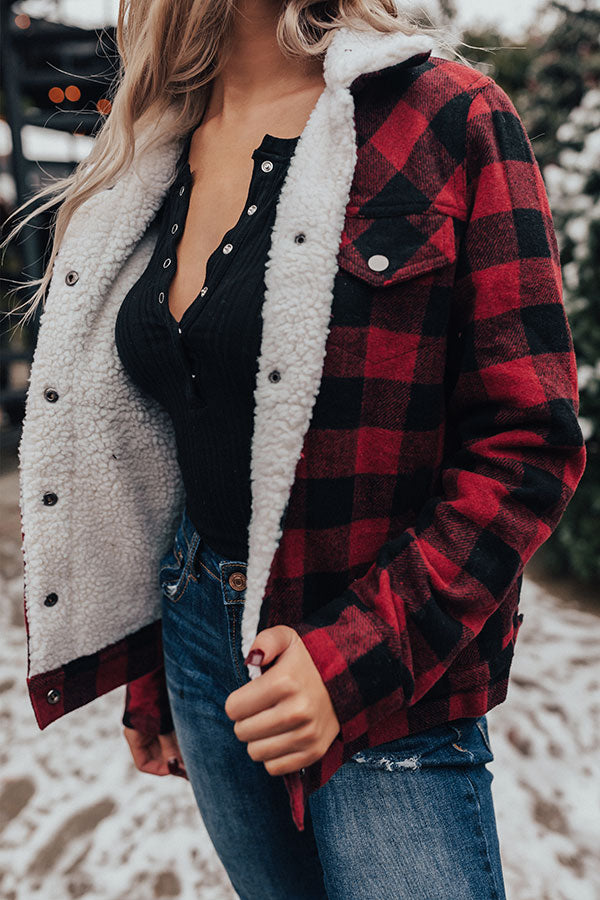Stay warm and protected from the chilly "winter whispers" with this adorable jacket featuring thick material patterned with a black and red buffalo check print, soft sherpa interior lining, long loose sleeves with fitted cuffs, two accent chest pockets with flap closures, a collared neckline, and a relaxed button up front silhouette that falls into a straight hemline! You can style this versatile piece with just about anything from a basic tank to a sweater, jeans to skirts or dresses, booties to wedges or sandals, clutches to totes, and hats to earrings! Measurements