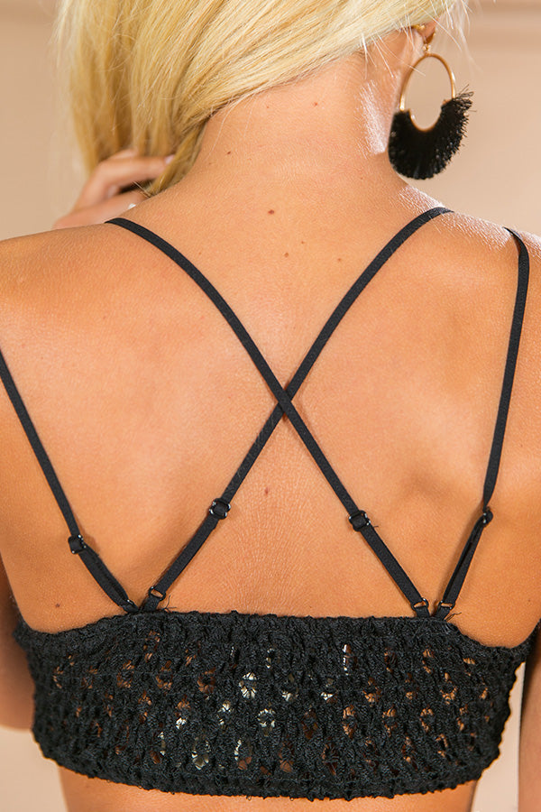 Add a sweet & sassy touch to any look with the "Wishes And Kisses Lace Bralette!" This crochet laced bralette features fully lined triangle cups & adjustable skinny straps that cross over a smocked elasticized back.