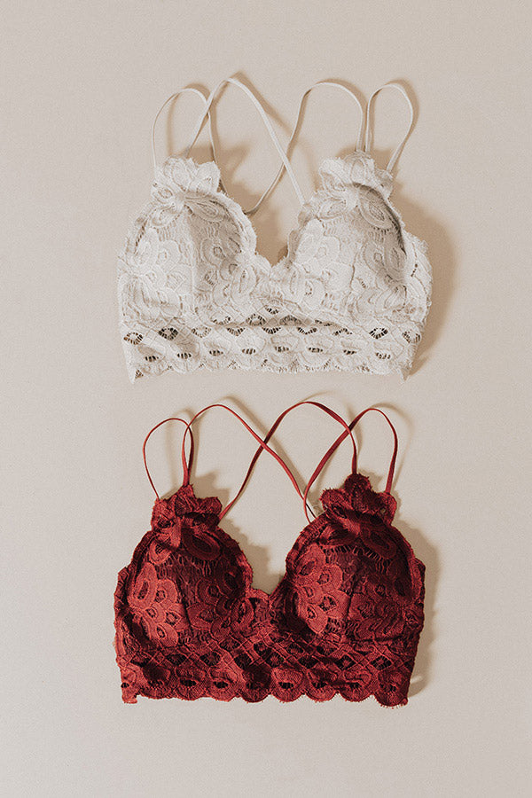 Add a sweet & sassy touch to any look with the "Wishes And Kisses Lace Bralette!" This crochet laced bralette features fully lined triangle cups & adjustable skinny straps that cross over a smocked elasticized back.