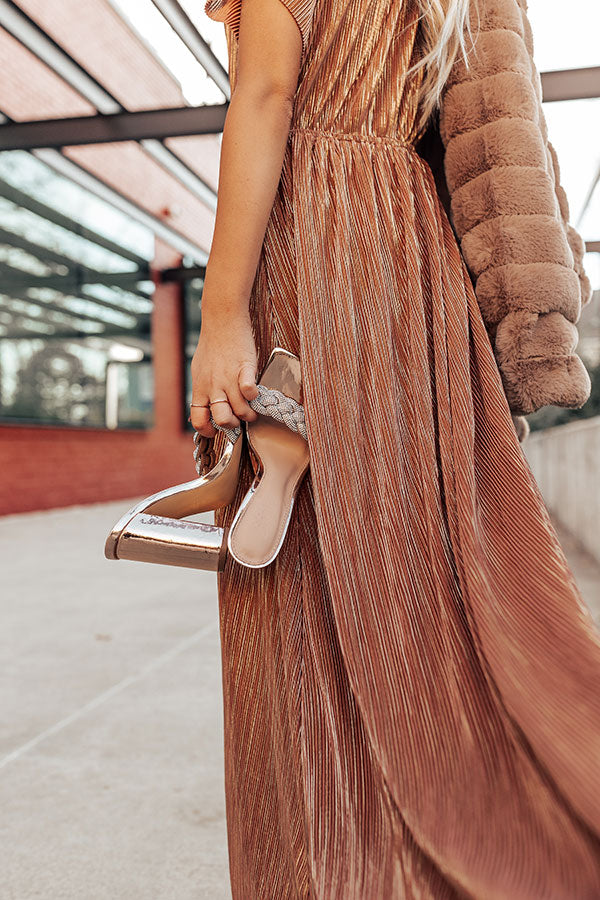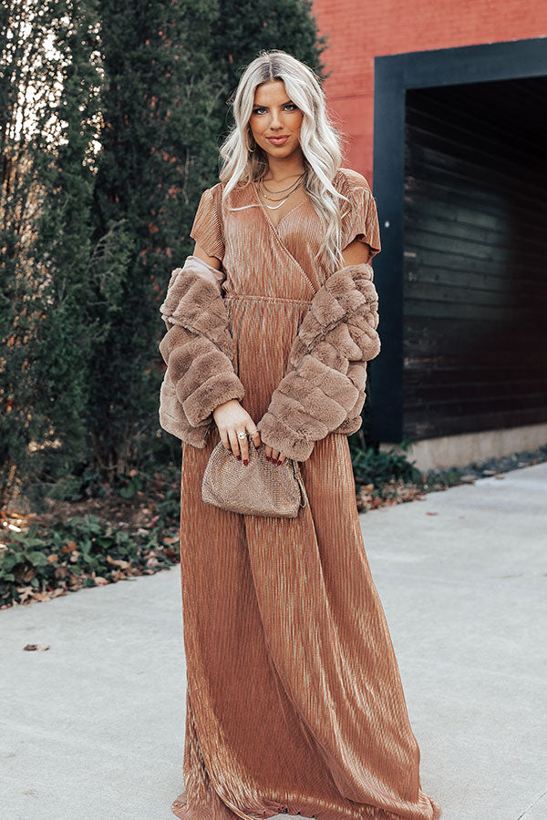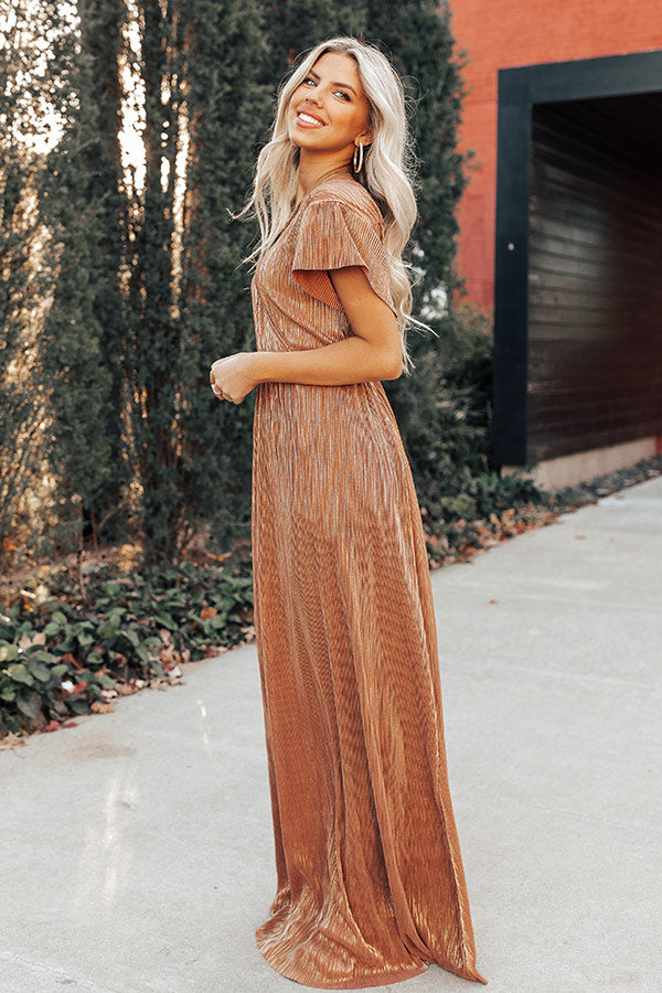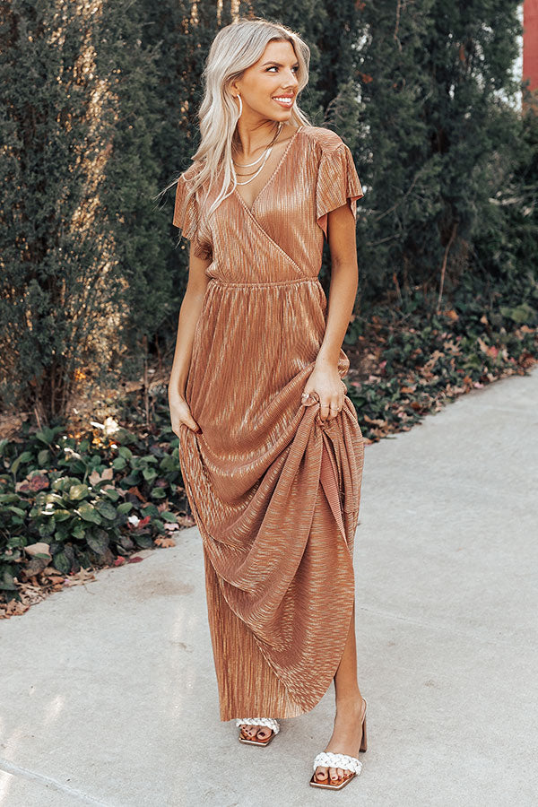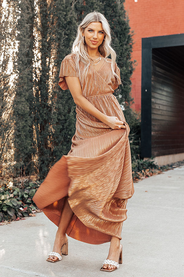 You will arrive dressed to impress in our beautiful shimmering brown 'Wishing For Love' maxi featuring lightweight material with pleated texturing, a rounded neckline, short flowy sleeves, a cinched waistline, and a relaxed skirt silhouette that cascades into a straight ankle-length hemline! Measurements