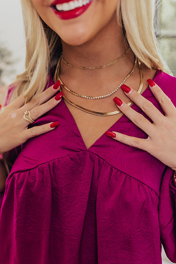 Add a dainty tough of glam with our luxe gold 'Wishing For Wanderlust' necklace featuring three layered pieces: a small paperclip chain choker, a medium length rhinestone chain, and a longer snake chain!
