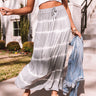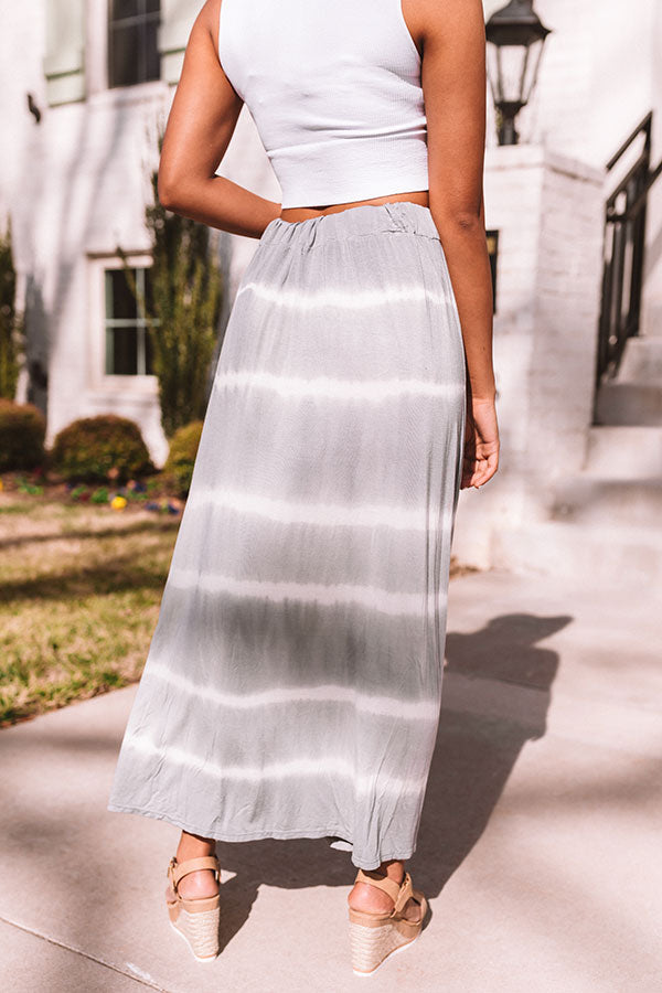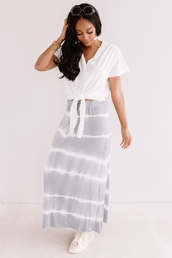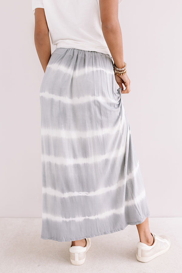 Your OOTD is sure to make waves when you wear this adorable grey skirt featuring soft lightweight material patterned with horizontal white tie dye stripes, a wide elastic waistline with a tie belt, and an ultra relaxed silhouette that falls into a straight lower-calf length hemlines! Measurements