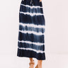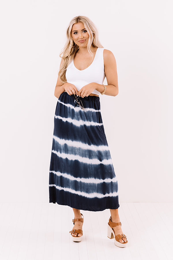 Your OOTD is sure to make waves when you wear this adorable navy skirt featuring soft lightweight material patterned with white horizontal tie dye stripes, a wide elastic waistline with a tie belt, and an ultra relaxed silhouette that falls into a straight lower-calf length hemlines!