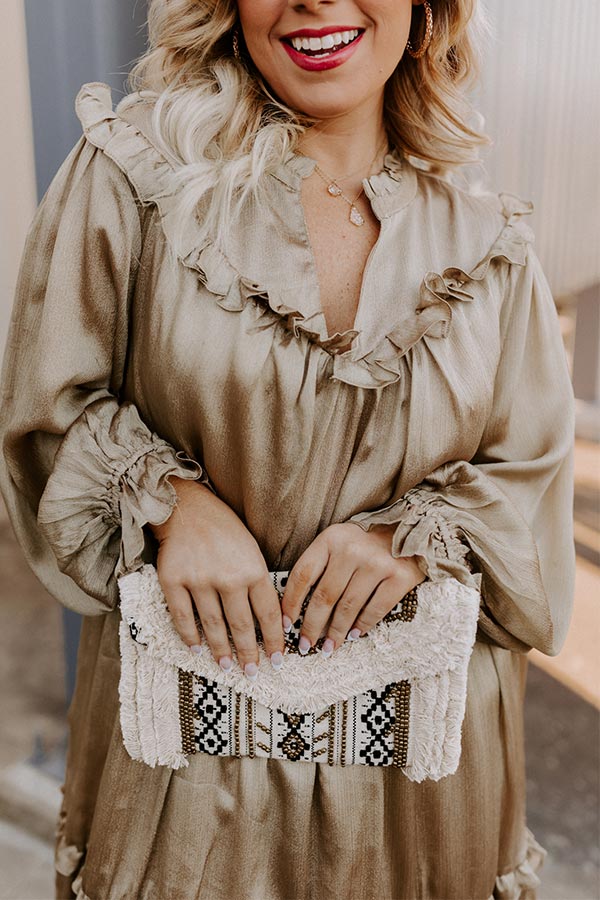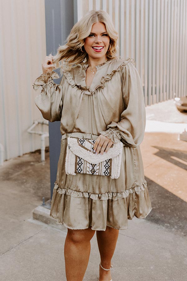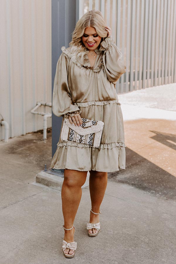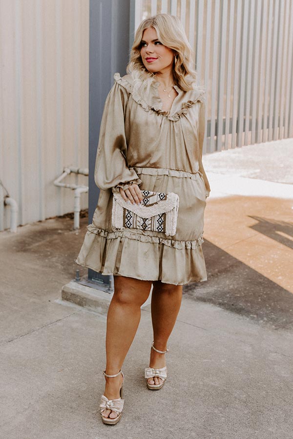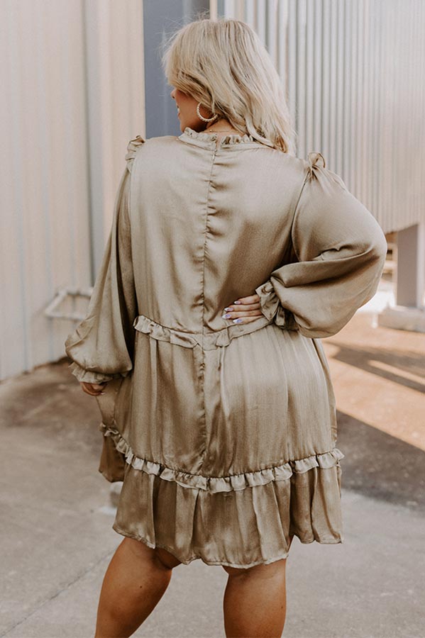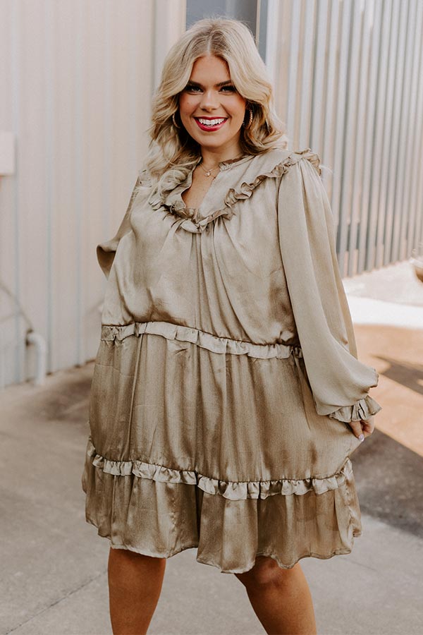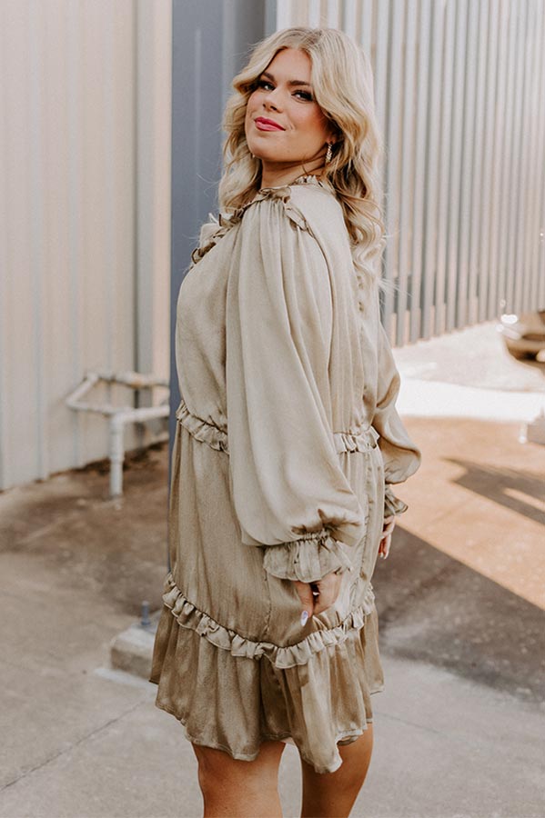 Here is the beautiful dress you've been wishing for this season! Features lightweight shimmering gold colored material, a comfortable lining, a v-neckline with ruffle detail, back zip closure, long loose sleeves with ruffled elastic cuffs, a relaxed skirt silhouette with ruffle details that falls into a straight hemline.