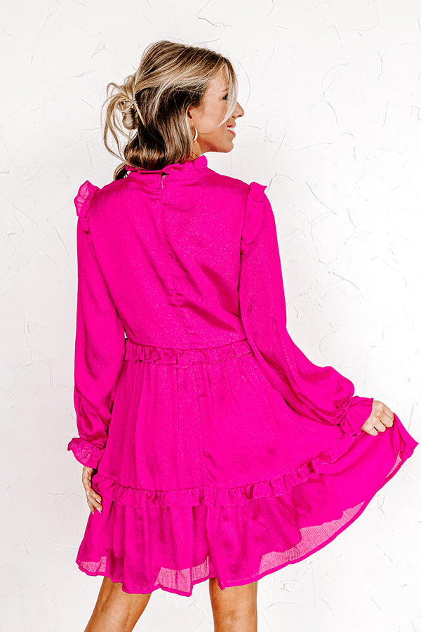 Here is the beautiful dress you've been wishing for this season! Features lightweight shimmering hot-pink colored material, a comfortable lining, a v-neckline with ruffle detail, back zip closure, long loose sleeves with ruffled elastic cuffs, a relaxed skirt silhouette with ruffle details that falls into a straight hemline.