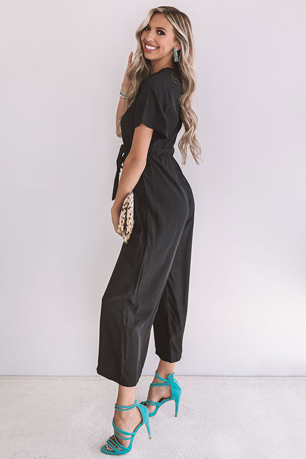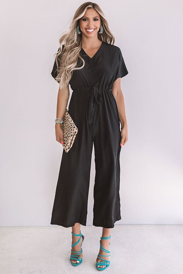 Freedom lies in being bold and nothing screams bold like a satin jumpsuit! This black piece will have you wishing for wine during the work day with its soft flowy fit, tie belt, and keyhole cutout in the back with a clasp closure! Pair with your best heel and favorite clutch for an outfit that will take you from day time to play time! Measurements