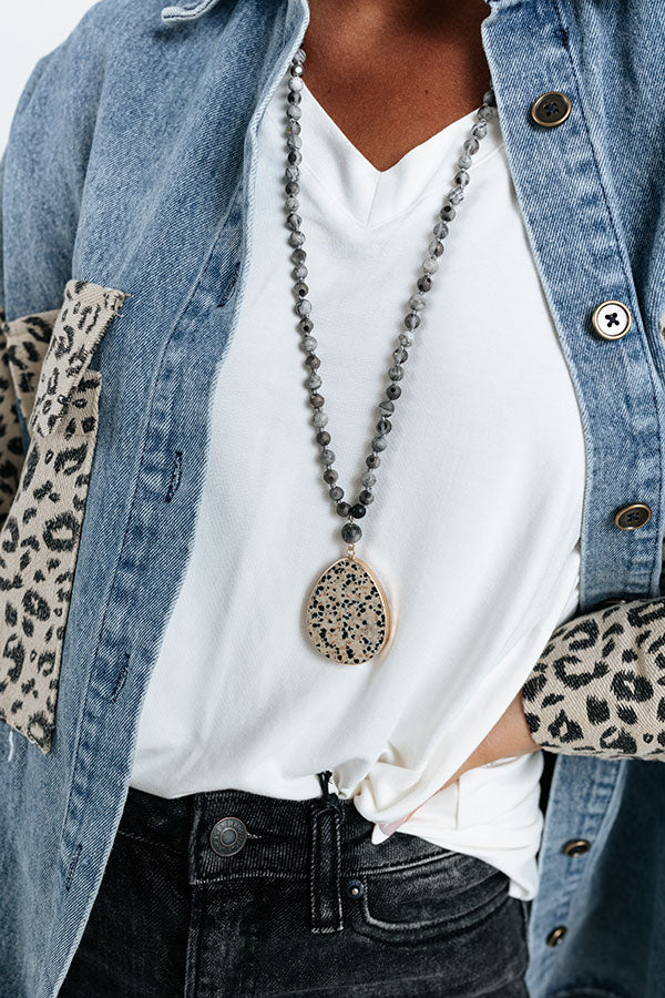 Make a gorgeous statement with our eye-catching 'Wishing You Well' necklace featuring a long dark grey hued beaded chain with a large semi precious teardrop pendant! Due to the natural stone there may be some variations in color, shape or size.