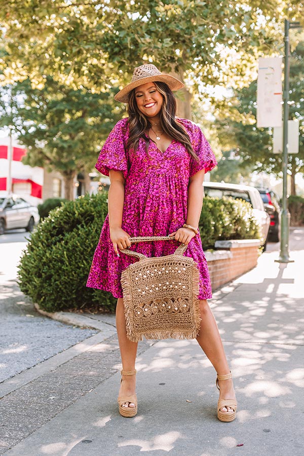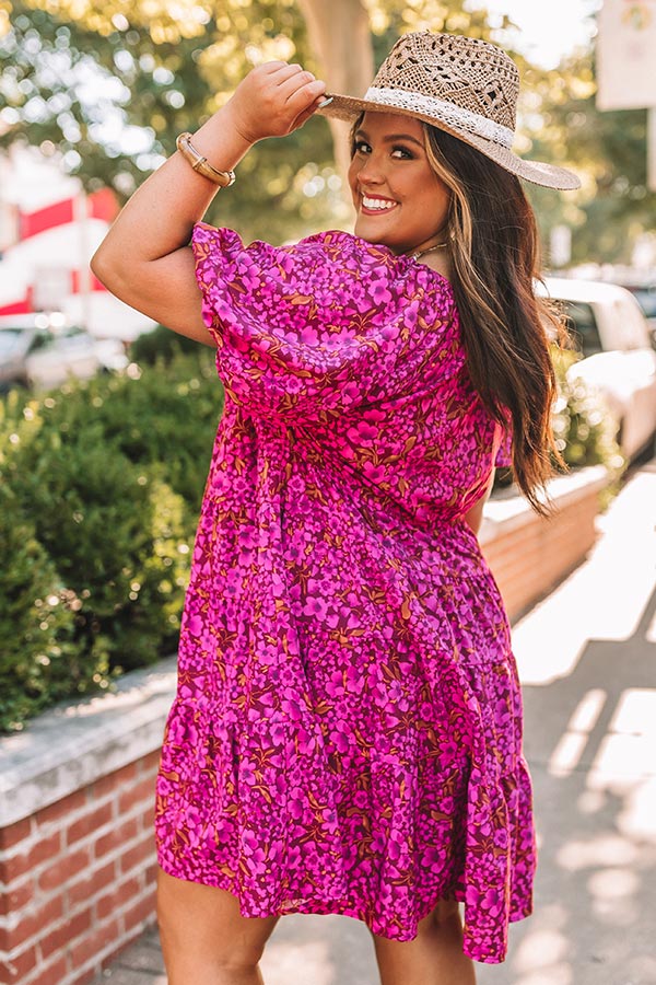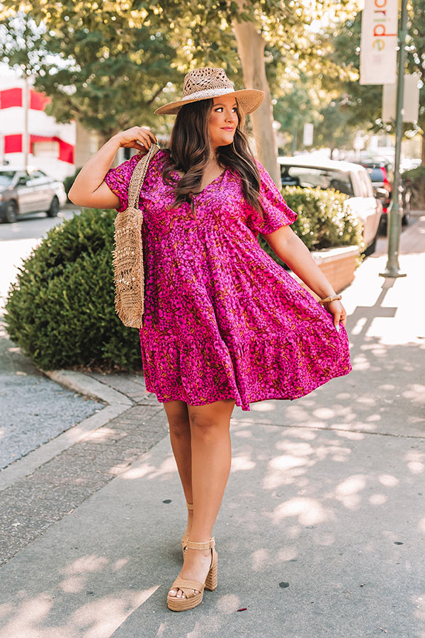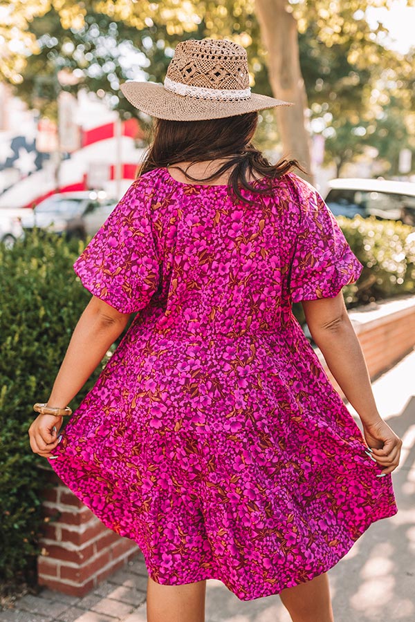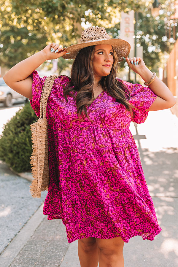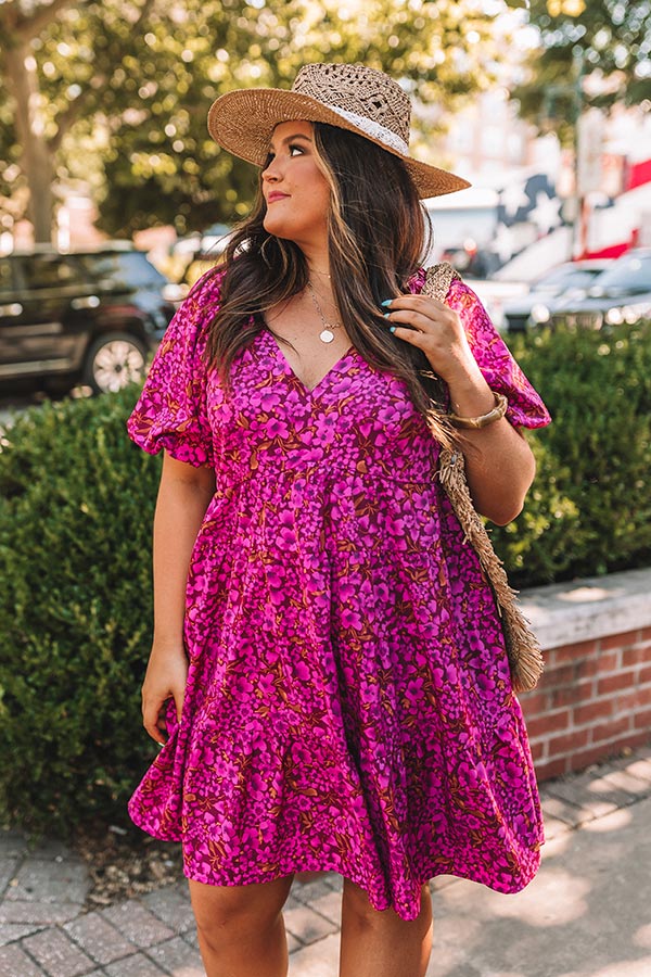 Show off your amazing style in our beautiful plus size 'Wisteria Avenue' dress featuring lightweight material patterned with a fuchsia and brown hued floral print, a v-cut neckline, short puff sleeves, and a babydoll silhouette that falls into a straight mid-thigh length hemline!