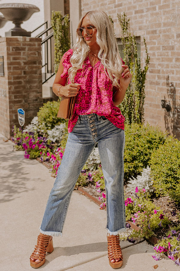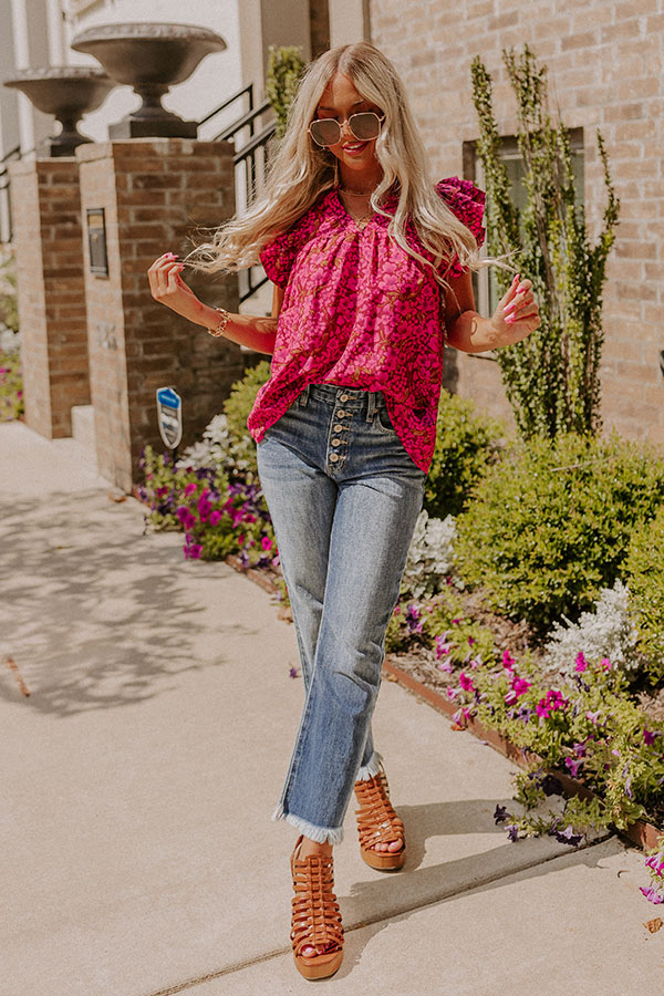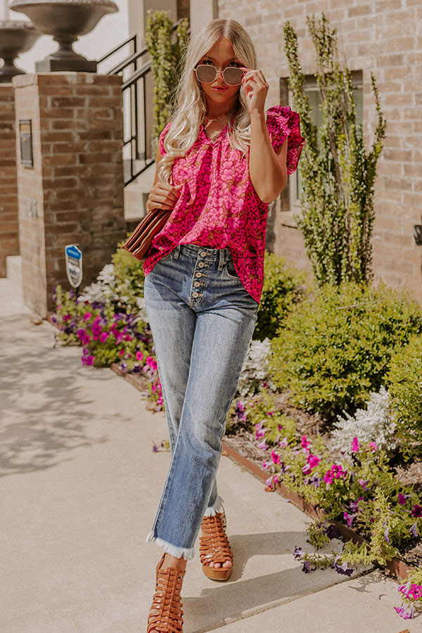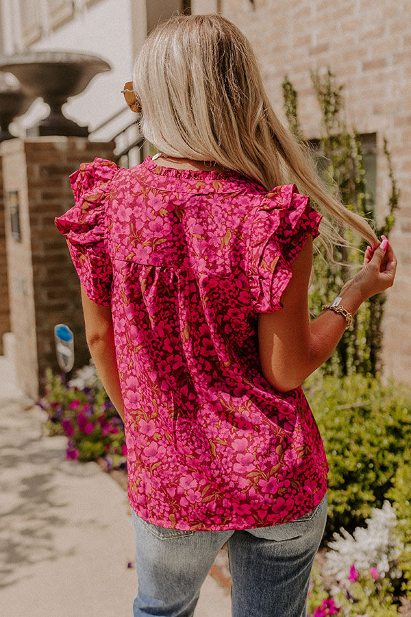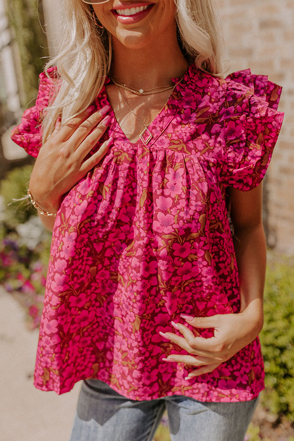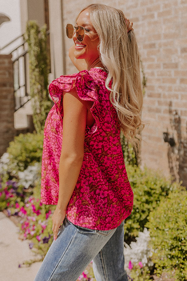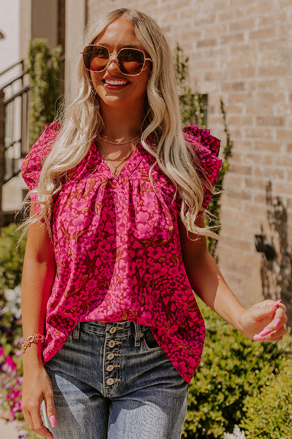 Show off your amazing style in our beautiful 'Wisteria Avenue Shift Top' featuring lightweight material patterned with a fuchsia and brown hued floral print, a high v-cut neckline, ruffled cap sleeves, and a relaxed silhouette that falls into a straight hemline!
