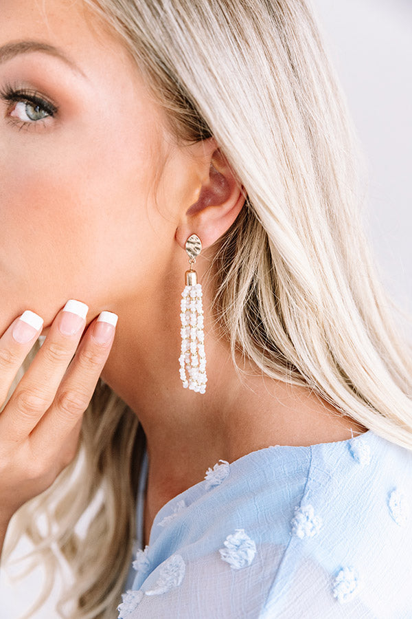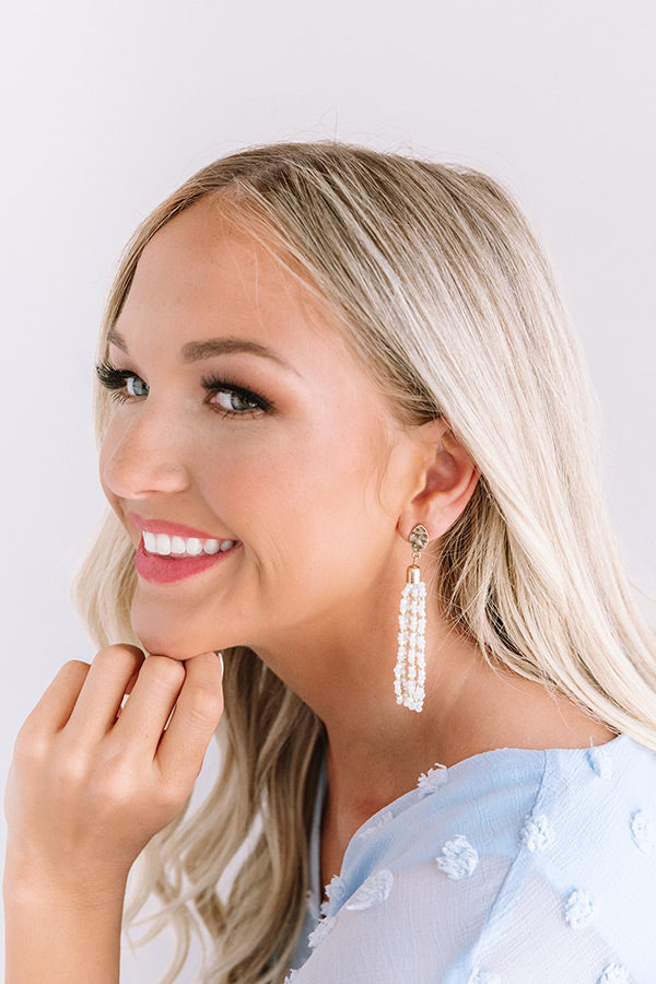 Add a subtle but glamorous tough to your OOTD by accessorizing with our darling "Wisteria Wishes" statement earrings featuring textured gold studs with dangling white beaded tassels!