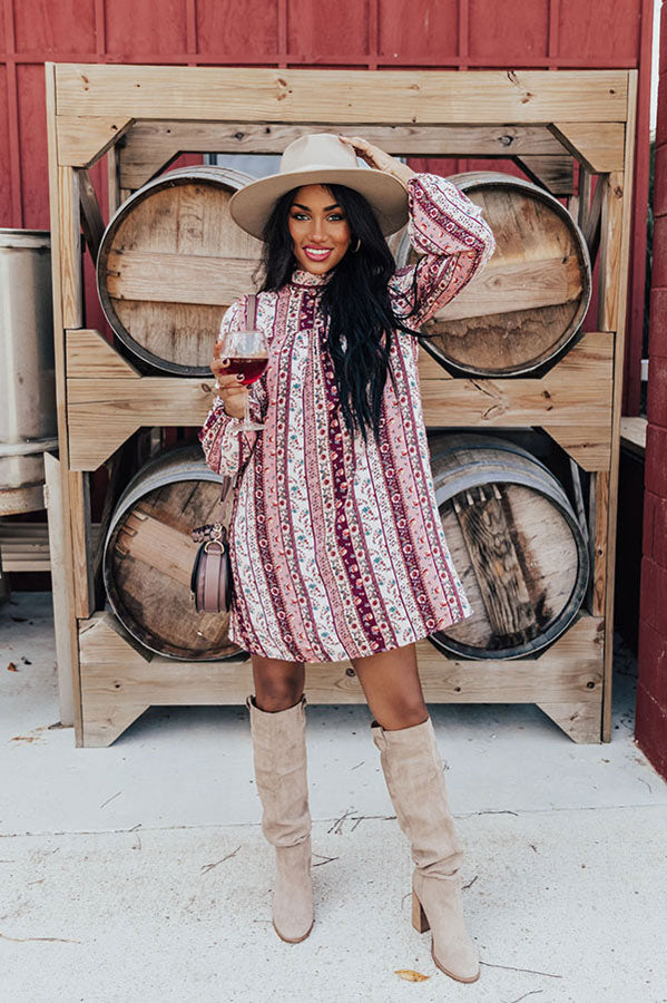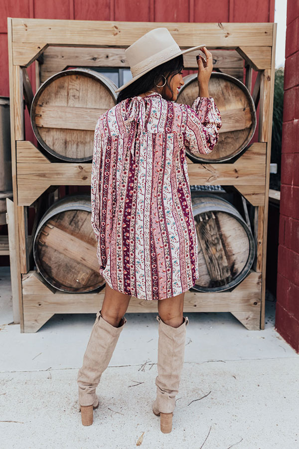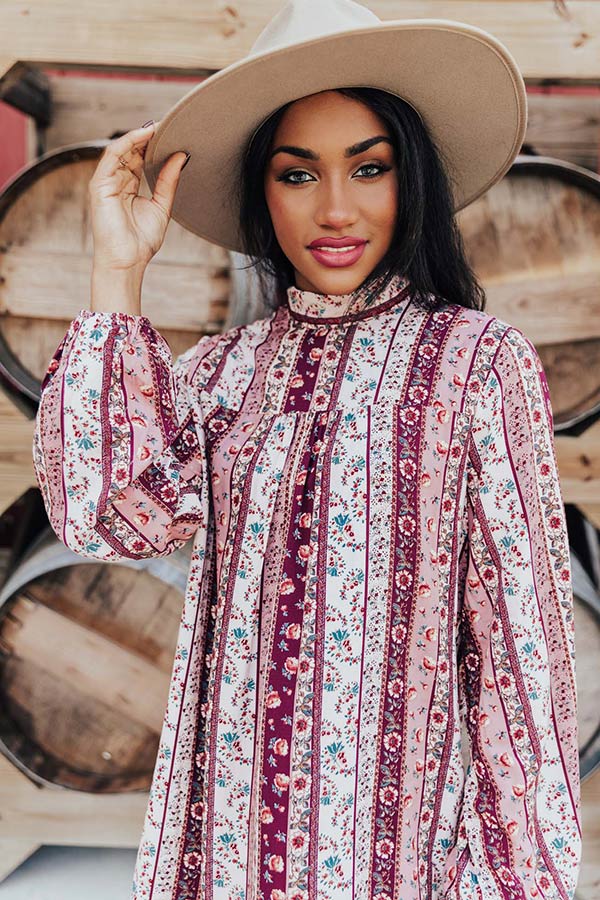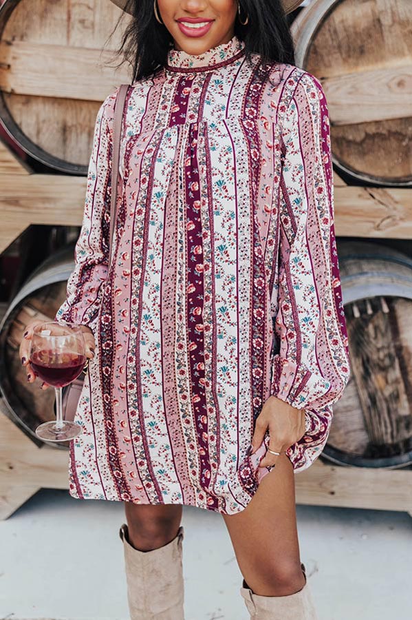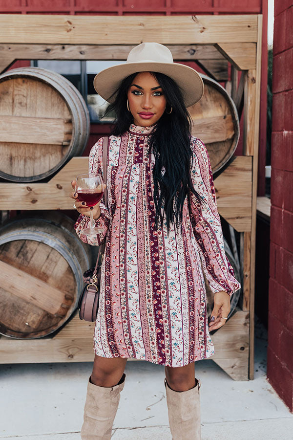 We have no doubt you will want to wear our stylish 'With Me Forever Shift Dress' on repeat with its lightweight material, unique blush hued floral print vertical stripes, a high neckline, long bubble sleeves, a keyhole accented upper back with a tie closure, and a relaxed silhouette that falls into a straight mid-thigh length hemline!