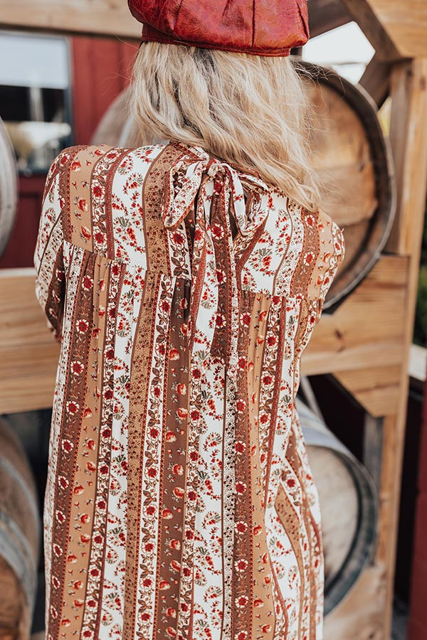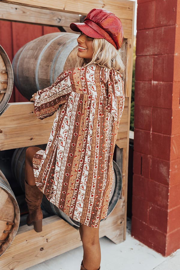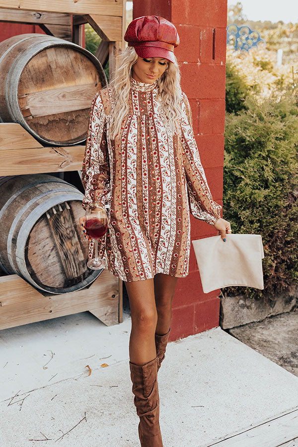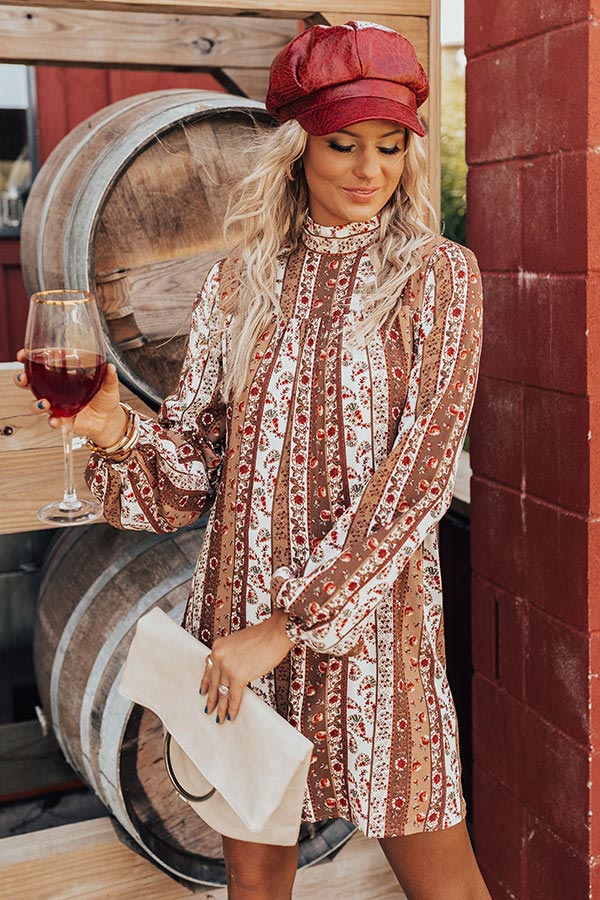 We have no doubt you will want to wear our stylish 'With Me Forever Shift Dress' on repeat with its lightweight material, unique brown hued floral print vertical stripes, a high neckline, long bubble sleeves, a keyhole accented upper back with a tie closure, and a relaxed silhouette that falls into a straight mid-thigh length hemline! Measurements