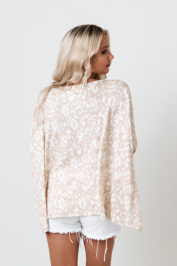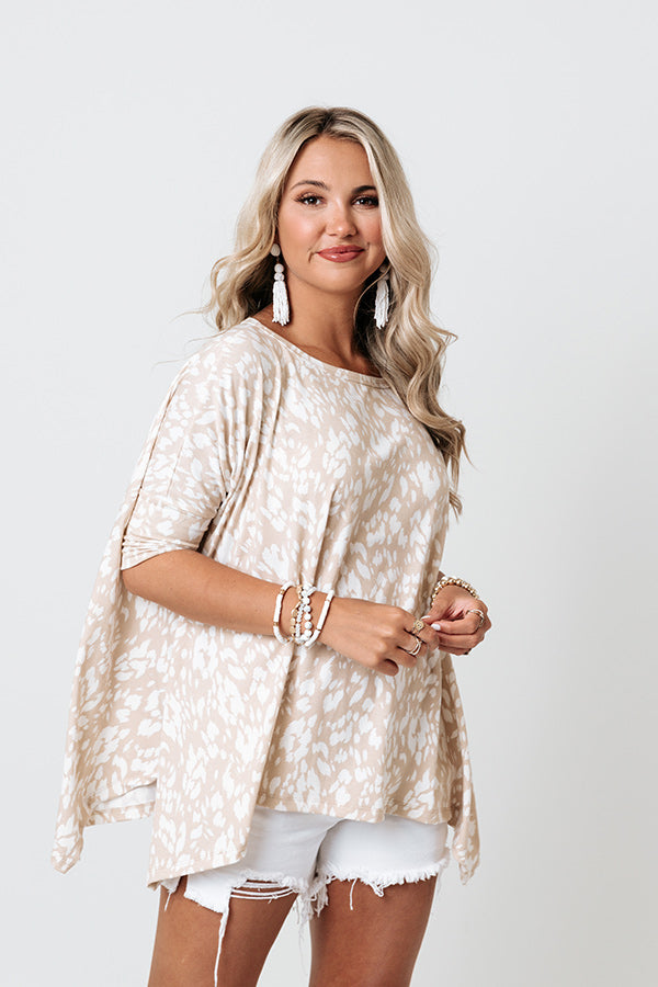 Add a touch of wonder and whimsy to your wardrobe with this adorable natural hued shift top featuring soft lightweight and flowy material patterned with a white spotted print, a high rounded neckline, short PIKO half sleeves, and an ultra slouched silhouette that falls into an uneven hemline! Measurements