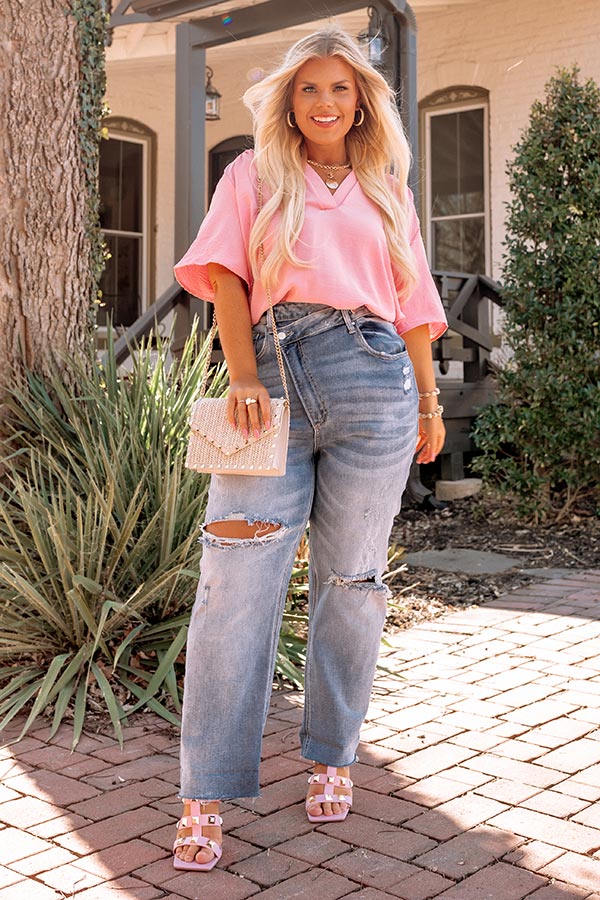 Plus Size - You are sure to have a wonderful weekend when you complete your look with this cute pink shift top featuring lightweight breezy material, a v-cut neckline, short sleeves, and a relaxed silhouette that falls into a rounded hemline!