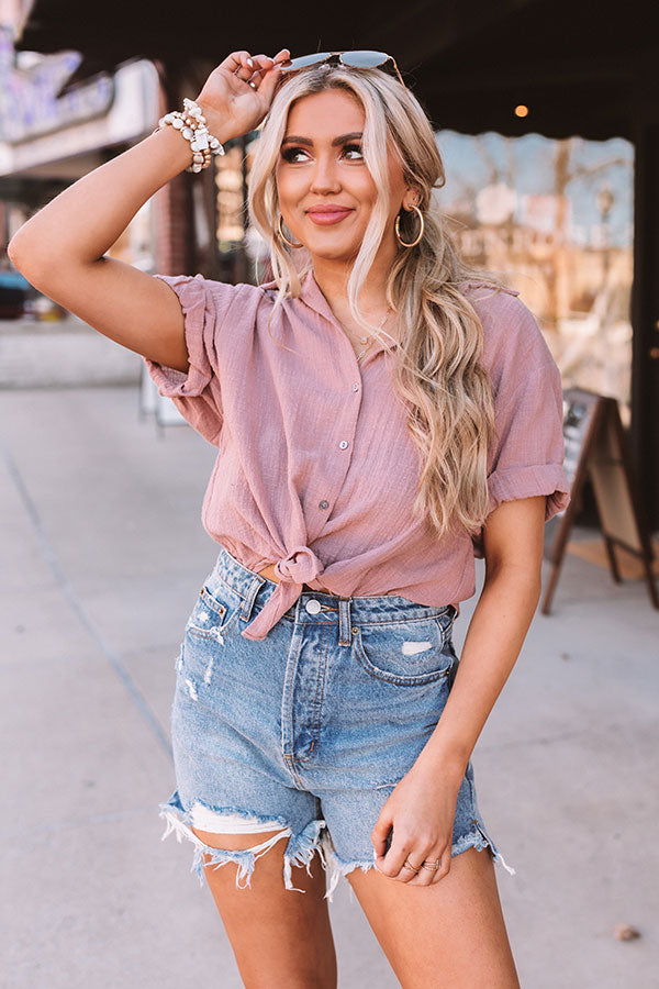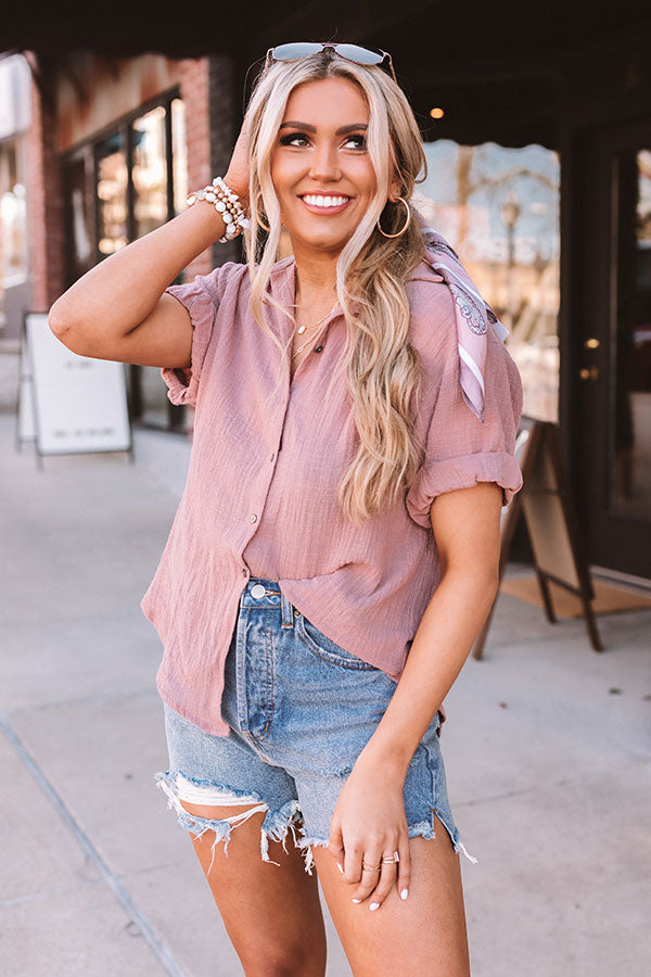 People are sure to be wonderstruck by your amazing look when you complete your look with this simple but stylish rustic rose colored top featuring lightweight linen-like material, a button down front with a collared neckline, short loose sleeves with rolled cuffs, and a relaxed but flattering silhouette that ends in a rounded hemline!