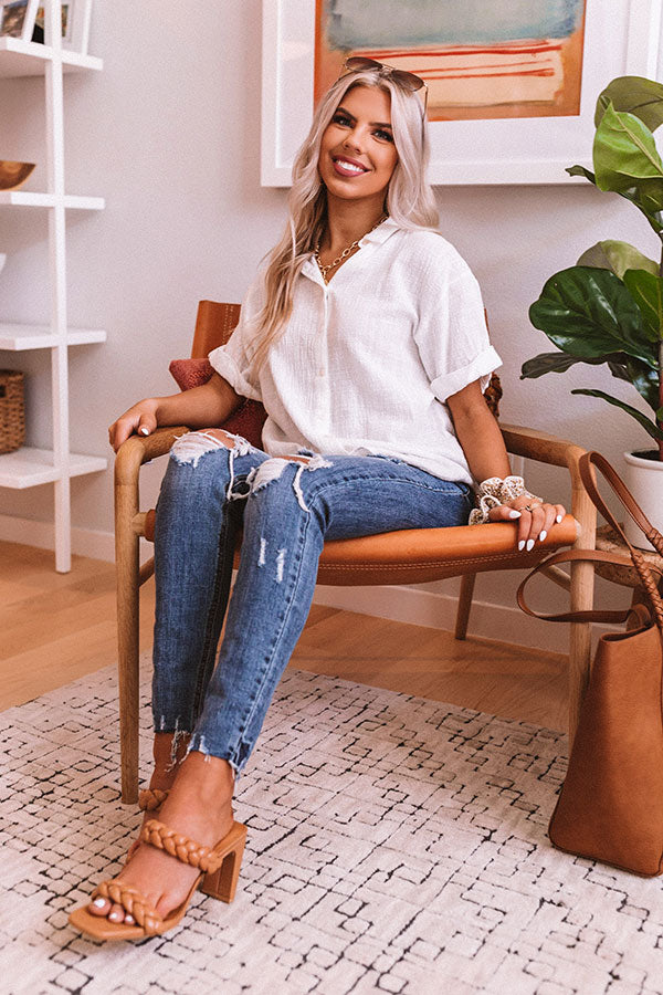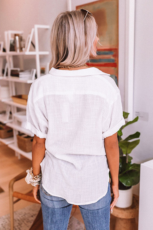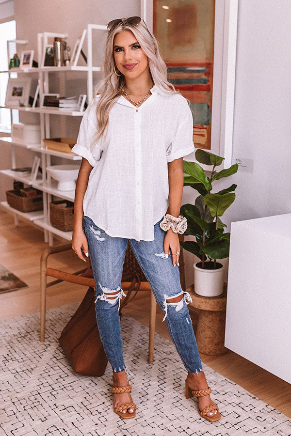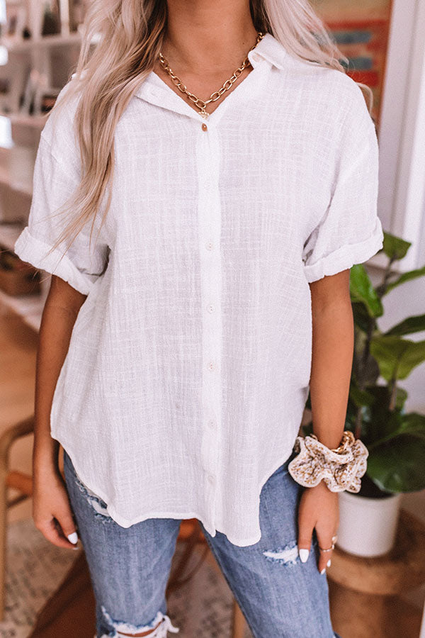 People are sure to be wonderstruck by your amazing look when you complete your look with this simple but stylish white top featuring lightweight linen-like material, a button down front with a collared neckline, short loose sleeves with rolled cuffs, and a relaxed but flattering silhouette that ends in a rounded hemline! Measurements