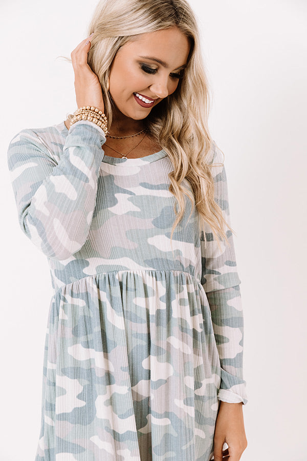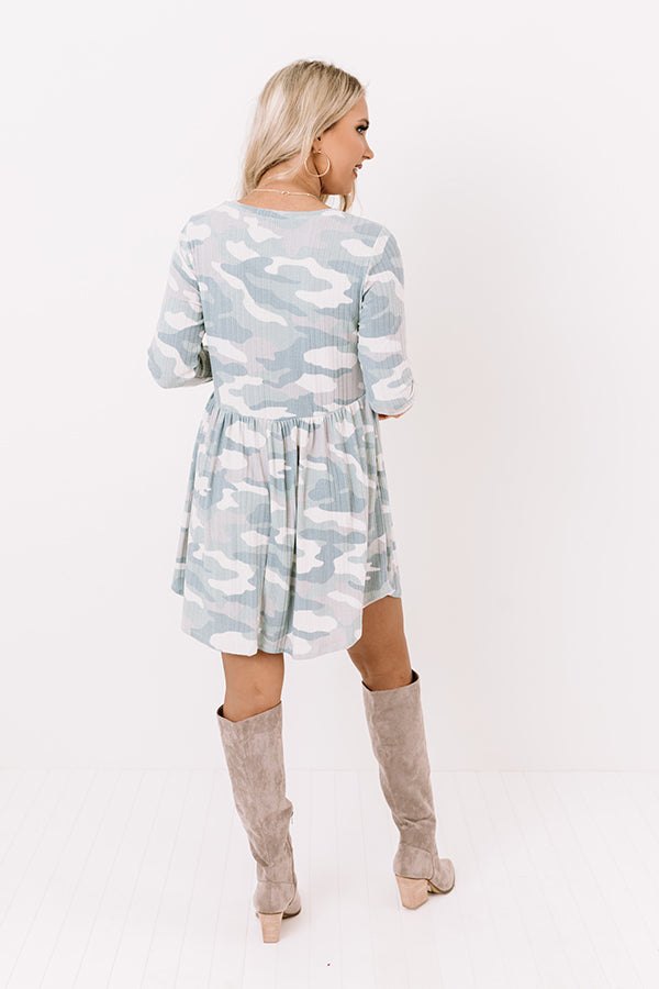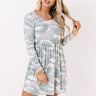 Keep it casual but cute with our trendy 'Woodland Whispers' babydoll dress featuring lightweight flowy material patterned with a blue/neutral hued camo print, subtle ribbed texturing, a high rounded neckline, long sleeves, and a fitted bodice that falls into a relaxed skirt silhouette with an uneven mid-thigh length hemline! Measurements