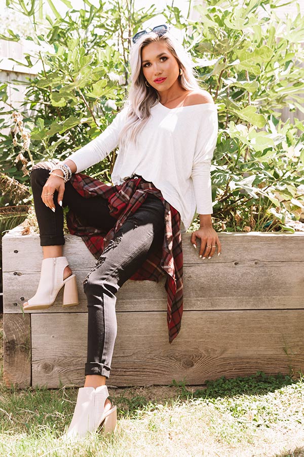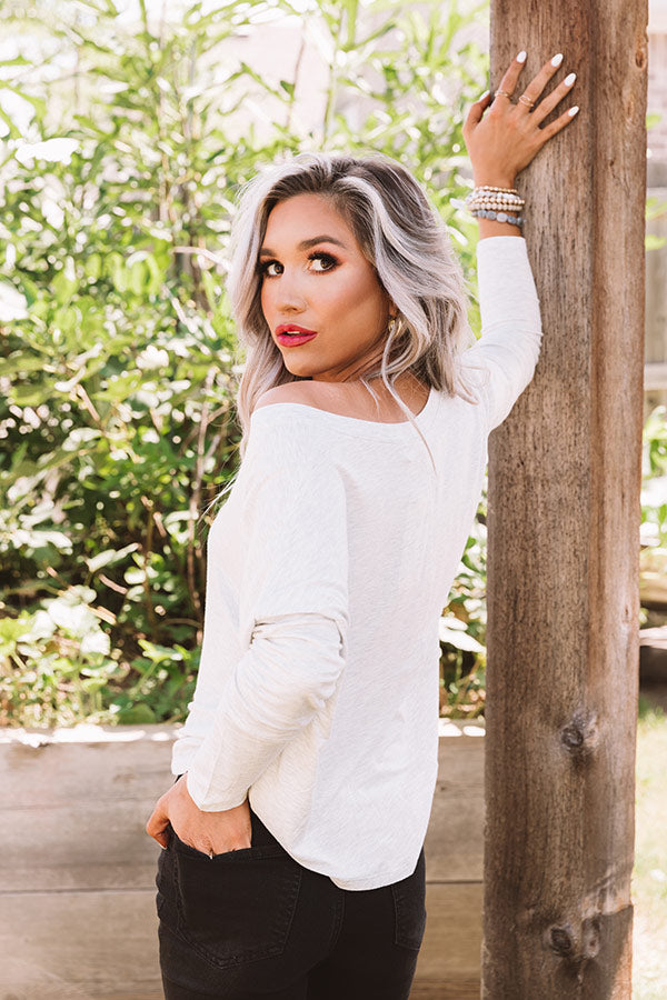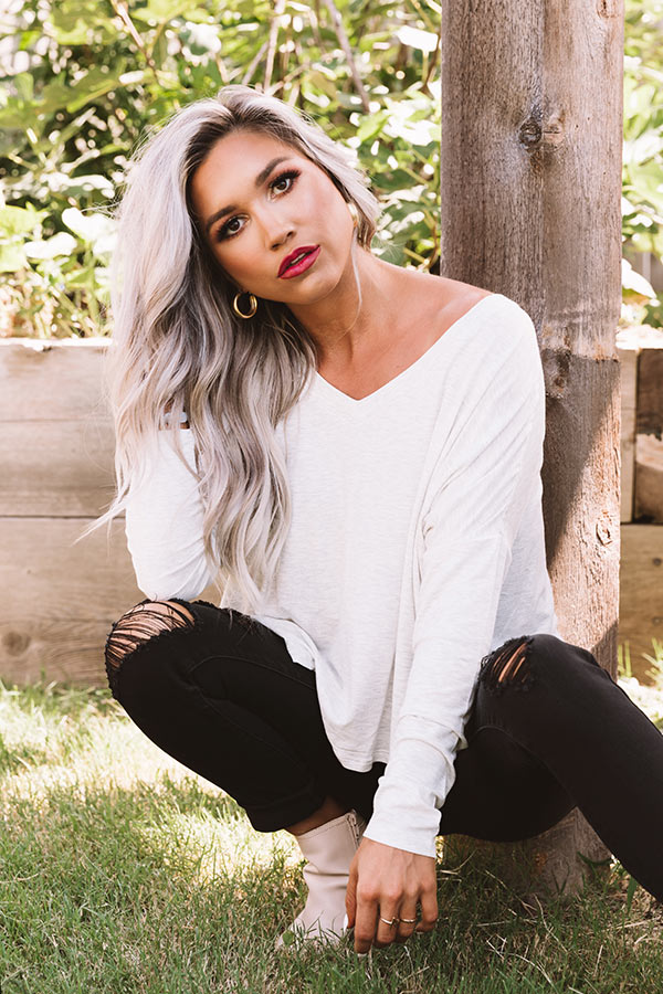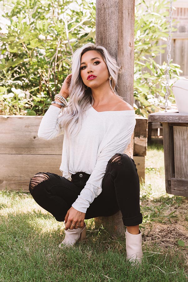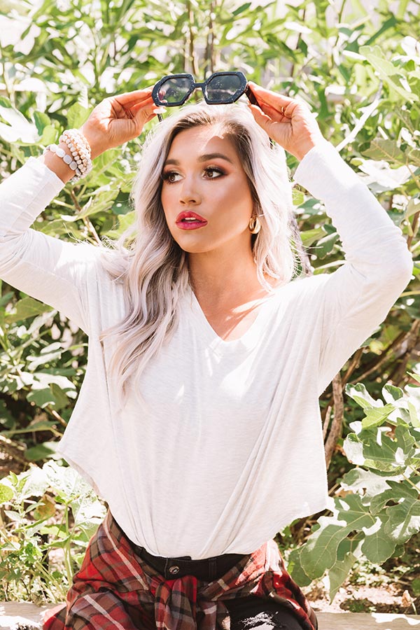 Our casual but cute light grey "Woodland Wishes Shift Top" is the upgrade your fall basics have been asking for with its soft lightweight material, wide v-cut neckline that can be worn off one shoulder, long fitted PIKO sleeves, and relaxed silhouette that falls into a rounded hemline! This versatile basic styles perfectly layered under a plaid shirt with some distressed black skinnies, sunnies, and neutral peep toe booties, but you can also wear it tucked into our "Wine Cellar Corduroy Skirt in Slate," our "Keep Up Snake Print Boot," and our "New On The Block Faux Leather Fringe Tote in Grey!"