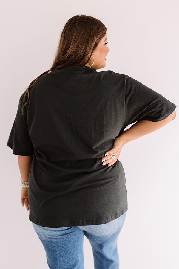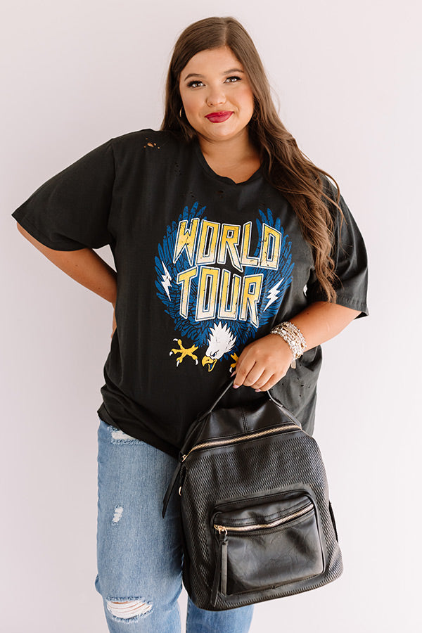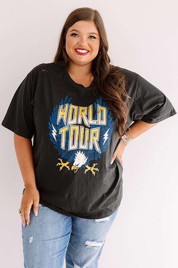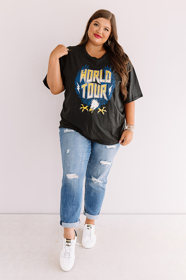 Plus Size - Travel in style this summer with our edgy black "World Tour" boyfriend tee featuring soft lightweight material with subtle distressed detailing, a high rounded neckline, short loose sleeves, an adorable blue and yellow eagle front graphic, and a relaxed silhouette that falls into a straight hemline! Measurements