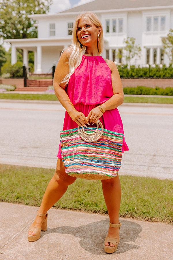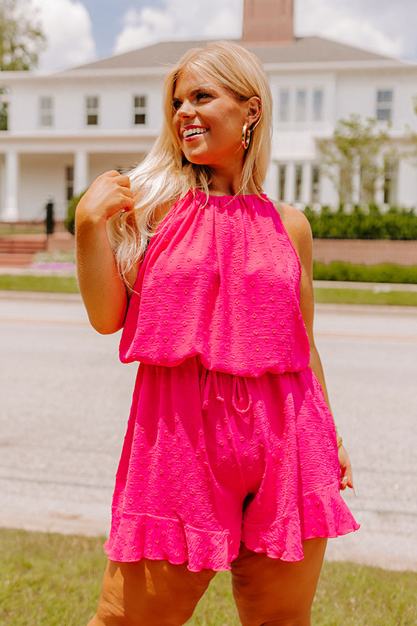Slay all day in our cute hot pink plus size 'World Wide Adventure Romper' featuring lightweight material with subtle polka dot texturing, a rounded neckline with a sleeveless fit, a cinched waistline with a tie closure, a slit back with a tie closure, and a relaxed short silhouette that falls into ruffled mid-thigh length hemlines!