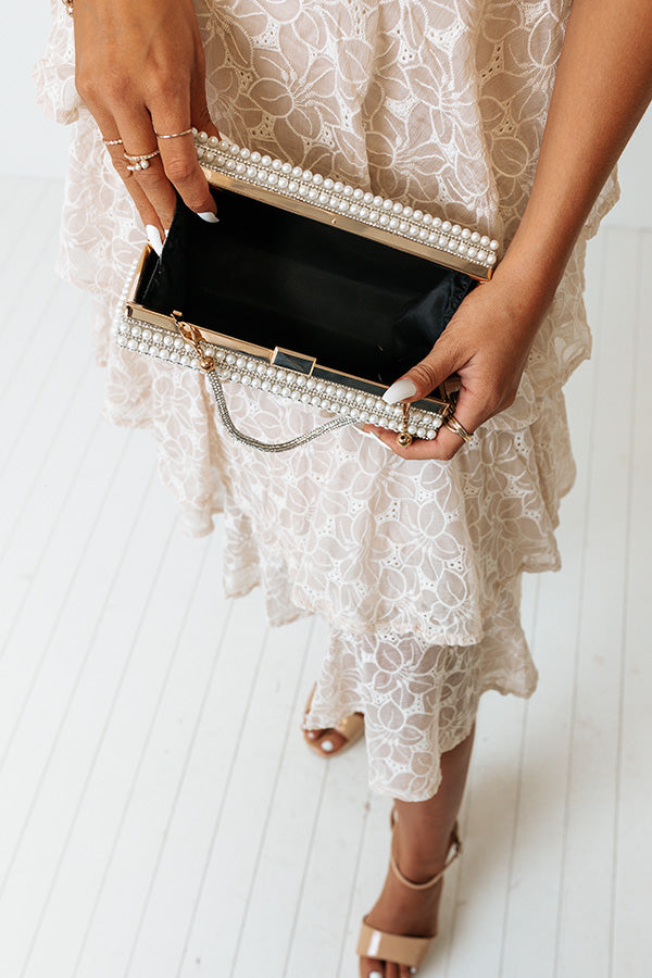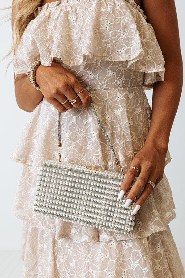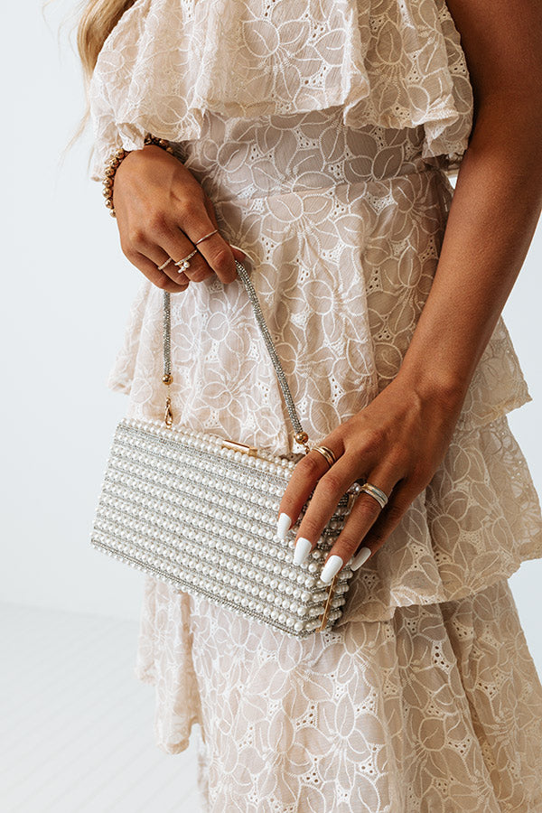 The perfect purse for any elegant evening occasion, our luxe 'Worth Staying' clutch features pearl embellished detailing, a silver pipe chain handle, and a structured rectangular fully lined box silhouette with a pressure snap closure!
